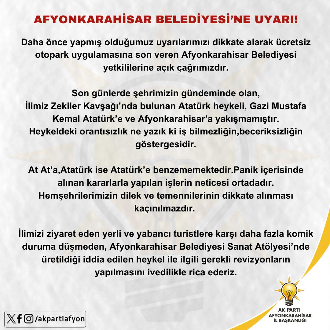 Yapılan açıklamada şu ifadelere yer verildi: “Daha önce yapmış olduğumuz uyarılarımızı dikkate alarak ücretsiz otopark uygulamasına son veren Afyonkarahisar Belediyesi yetkililerine açık çağrımızdır. Son günlerde şehrimizin gündeminde olan, İlimiz Zekiler Kavşağı’nda bulunan Atatürk heykeli, Gazi Mustafa Kemal Atatürk’e ve Afyonkarahisar’a yakışmamıştır. Heykeldeki orantısızlık ne yazık ki iş bilmezliğin, beceriksizliğin göstergesidir. At At’a, Atatürk ise Atatürk’e benzememektedir. Panik içerisinde alınan kararlarla yapılan işlerin neticesi ortadadır. Hemşerilerimizin dilek ve temennilerinin dikkate alınması kaçınılmazdır. İlimizi ziyaret eden yerli ve yabancı turistlere karşı daha fazla komik duruma düşmeden, Afyonkarahisar Belediyesi Sanat Atölyesi’nde üretildiği iddia edilen heykel ile ilgili gerekli revizyonların yapılmasını ivedilikle rica ederiz.” >>>Haber Merkezi