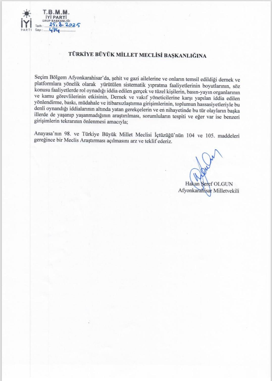 Olgun’un Meclis Araştırması verdiği teklif şu şekilde: “Seçim Bölgem Afyonkarahisar’da, şehit ve gazi ailelerine ve onların temsil edildiği dernek ve platformlara yönelik olarak yürütülen sistematik yıpratma faaliyetlerinin boyutlarının, söz konusu faaliyetlerde rol oynadığı iddia edilen gerçek ve tüzel kişilerin, basın-yayın organlarının ve kamu görevlilerinin etkisinin, Dernek ve vakıf yöneticilerine karşı yapıldığı iddia edilen yönlendirme, baskı, müdahale ve itibarsızlaştırma girişimlerinin, toplumun hassasiyetleriyle bu denli oynandığı iddialarının altında yatan gerekçelerin ve en nihayetinde bu tür olayların başka illerde de yaşanıp yaşanmadığının araştırılması, sorumluların tespiti ve eğer var ise benzeri girişimlerin tekrarının önlenmesi amacıyla; Anayasa’nın 98. ve Türkiye Büyük Millet Meclisi İç Tüzüğü’nün 104 ve 105. maddeleri gereğince bir Meclis Araştırması açılmasını arz ve teklif ederiz.