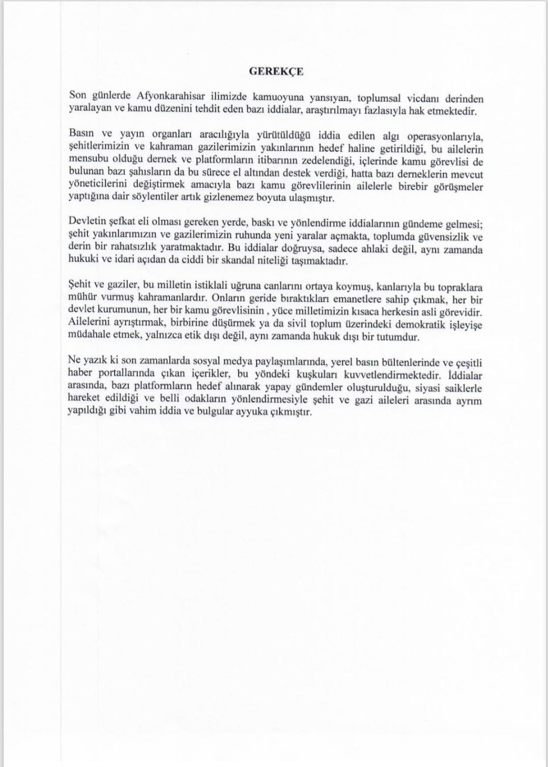 Son günlerde Afyonkarahisar ilimizde kamuoyuna yansıyan, toplumsal vicdanı derinden yaralayan ve kamu düzenini tehdit eden bazı iddialar, araştırılmayı fazlasıyla hak etmektedir. Basın ve yayın organları aracılığıyla yürütüldüğü iddia edilen algı operasyonlarıyla, şehitlerimizin ve kahraman gazilerimizin yakınlarının hedef haline getirildiği, bu ailelerin mensubu olduğu dernek ve platformların itibarının zedelendiği, içlerinde kamu görevlisi de bulunan bazı şahısların da bu sürece el altından destek verdiği, hatta bazı derneklerin mevcut yöneticilerini değiştirmek amacıyla bazı kamu görevlilerinin ailelerle birebir görüşmeler yaptığına dair söylentiler artık gizlenemez boyuta ulaşmıştır. Devletin şefkat eli olması gereken yerde, baskı ve yönlendirme iddialarının gündeme gelmesi; şehit yakınlarımızın ve gazilerimizin ruhunda yeni yaralar açmakta, toplumda güvensizlik ve derin bir rahatsızlık yaratmaktadır. Bu iddialar doğruysa, sadece ahlaki değil, aynı zamanda hukuki ve idari açıdan da ciddi bir skandal niteliği taşımaktadır. Şehit ve gaziler, bu milletin istiklali uğruna canlarını ortaya koymuş, kanlarıyla bu topraklara mühür vurmuş kahramanlardır. Onların geride bıraktıkları emanetlere sahip çıkmak, her bir devlet kurumunun, her bir kamu görevlisinin, yüce milletimizin kısaca herkesin asli görevidir. Ailelerini ayrıştırmak, birbirine düşürmek ya da sivil toplum üzerindeki demokratik işleyişe müdahale etmek, yalnızca etik dışı değil, aynı zamanda hukuk dışı bir tutumdur. Ne yazık ki son zamanlarda sosyal medya paylaşımlarında, yerel basın bültenlerinde ve çeşitli haber portallarında çıkan içerikler, bu yöndeki kuşkuları kuvvetlendirmektedir. İddialar arasında, bazı platformların hedef alınarak yapay gündemler oluşturulduğu, siyasi saiklerle hareket edildiği ve belli odakların yönlendirmesiyle şehit ve gazi aileleri arasında ayrım yapıldığı gibi vahim iddia ve bulgular ayyuka çıkmıştır.” >>>Haber Merkezi