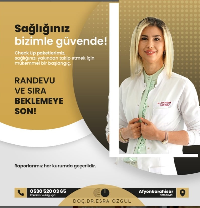 Afyonkarahisar’ın sevilen ve başarı doktorlarından Doç. Dr. Esra Özgül, Selçuklu Mahallesi Şehit Erdal Hamamcı Caddesi’ndeki yeni kliniğinde hizmet vermeye devam ediyor. Özgül Klinik’te randevu ve sıra beklemeden aynı gün içinde işlem ve sonuçlar veriliyor. Özgül Klinik’e irtibat ve randevu için 0530 520 03 65 nolu telefondan ulaşabilirsiniz.>>>Gazete3