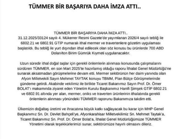 Alınan bu kararın Türkiye’nin doğal taş üretimi ve ihracatına önemli katkılar sağlaması beklenirken; TÜMMER Yönetimi, MHP Genel Başkanı Devlet Bahçeli, Afyonkarahisar Milletvekili Mehmet Taytak ve Ticaret Bakanı Prof. Dr. Ömer Bolat’a desteklerinden dolayı teşekkür etti.