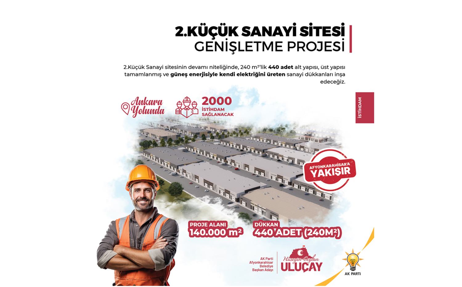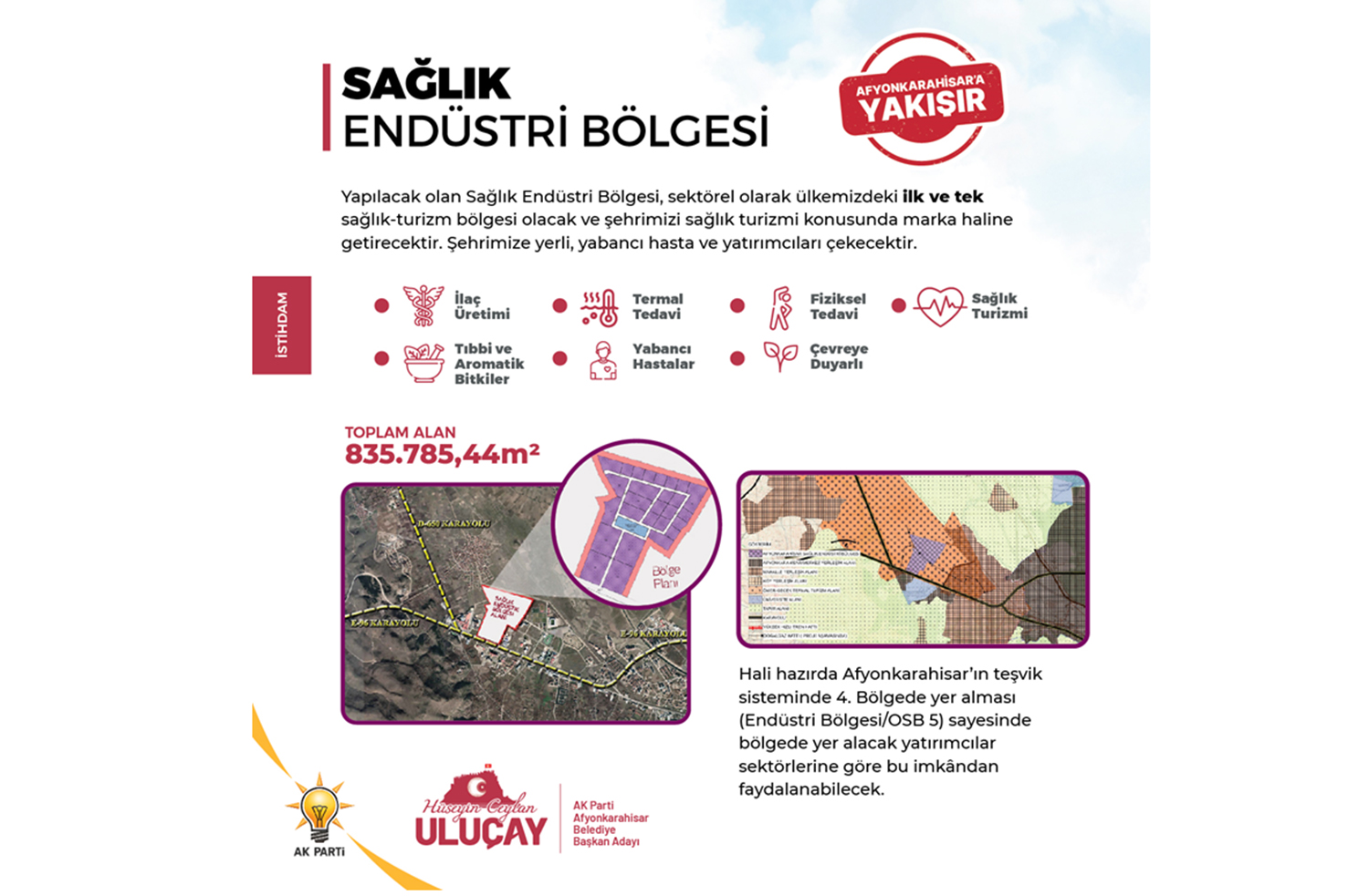 AK Parti Afyonkarahisar Belediye Başkan Adayı Hüseyin Ceylan Uluçay’ın proje tanıtım programında konuşan Aile ve Sosyal Hizmetler Bakanı Mahinur Özdemir Göktaş, “Üstlendiği her görevi büyük bir başarıyla icra eden Sayın Uluçay’ı dinamizmi ve enerjisi ile Afyonkarahisar için büyük bir fırsat olarak görüyorum” dedi. 109 proje açıklayan Uluçay’ın, dikkat çeken projelerinin başında 100.yıl OSB projesi oldu.