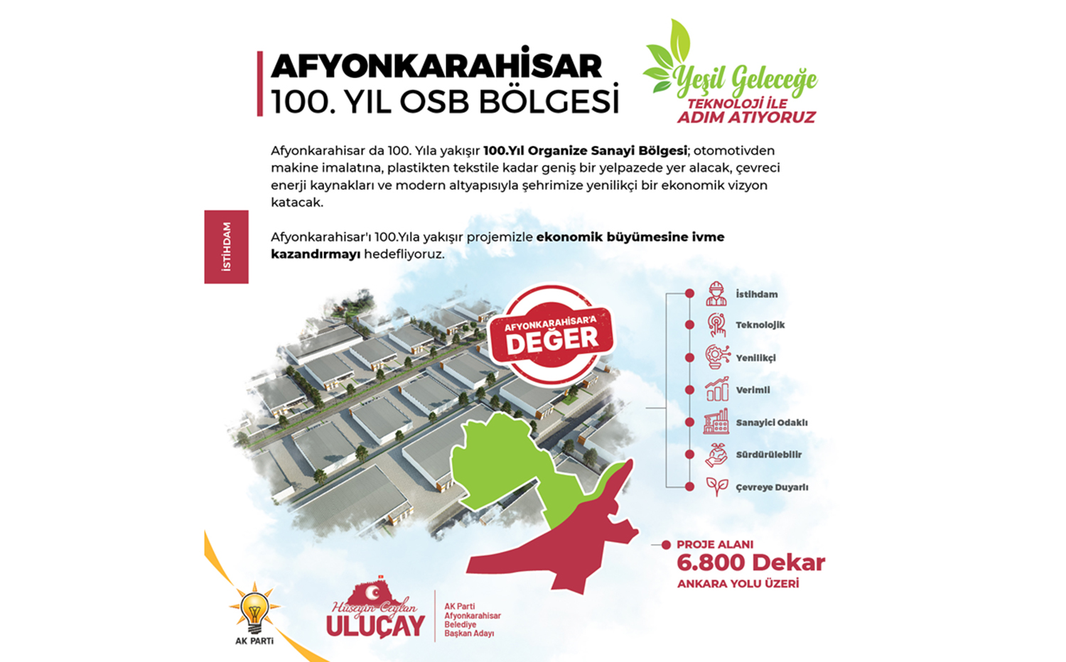 Uluçay, toplantıda 109 proje açıkladı. Kentsel dönüşümden sosyal projelere teknolojiden trafiğe kadar çok önemli projelerin müjdesini veren Uluçay belediye personelini de unutmadı. Uluçay refah seviyesinin yükseltileceği ve belediye personelinin çok uygun fiyata konutların yapılacağını müjdeledi. Uluçay ayrıca dar gelirli vatandaşlar için de konut yapılacağını duyurdu. 100.yıl OSB projesini de açıklayan Uluçay, “Afyonkarahisar’da 100.Yıla yakışır 100.yıl Organize Sanayi Bölgesi, otomotivden makine imalatına, plastikten tekstile kadar geniş bir yelpazede yer alacak. Çevreci enerji kaynakları ve modern altyapısıyla şehrimize yenilikçi bir ekonomik vizyon katacak. Afyonkarahisar’ı 100.yıla yakışır projemizle ekonomik büyümemize ivme kazandırmayı hedefliyoruz” ifadelerine yer verdi. 100.Yıl Organize Sanayi Bölgesi Ankara yolu üzerinde 6800 dekar proje alanına sahip.