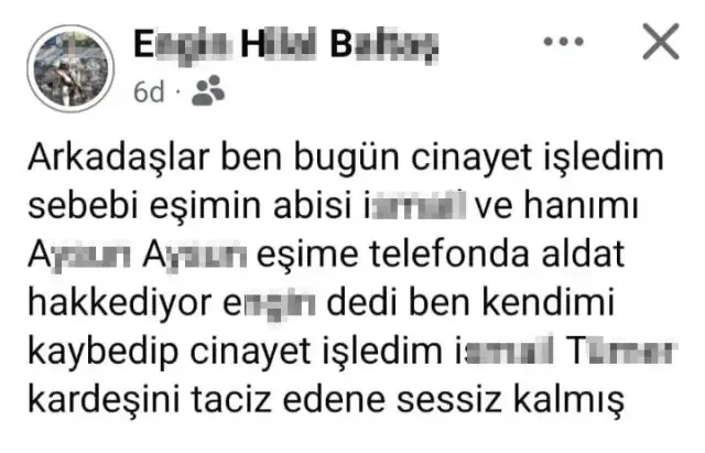 Cinayetin ardından olay yerinden kaçan zanlı, kısa süre sonra jandarmaya teslim oldu. Bu sırada sosyal medya hesabından yaptığı paylaşımda suçu itiraf ettiği ortaya çıktı. Engin B., paylaşımında “Arkadaşlar ben bugün cinayet işledim. Sebebi, eşimin abisi İ. ve hanımı A. eşime telefonda ‘Aldat, hak ediyor Engin’ dedi. Ben kendimi kaybedip cinayet işledim. İ.T., kardeşini taciz edene sessiz kalmış” ifadelerini kullandı. Bu paylaşım, sosyal medyada büyük yankı uyandırdı.
