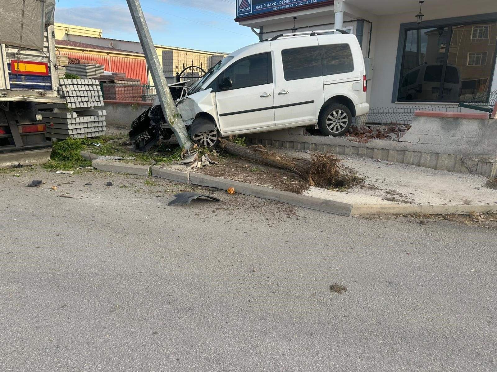 Çorum’un Alaca ilçesinde sürücüsünün direksiyon hakimiyetini kaybetmesi ile yoldan çıkan hafif ticari araç önce ağaca, ardından elektrik direğine çarptı. 1 kişinin yaralandığı kaza güvenlik kamerasına yansıdı.