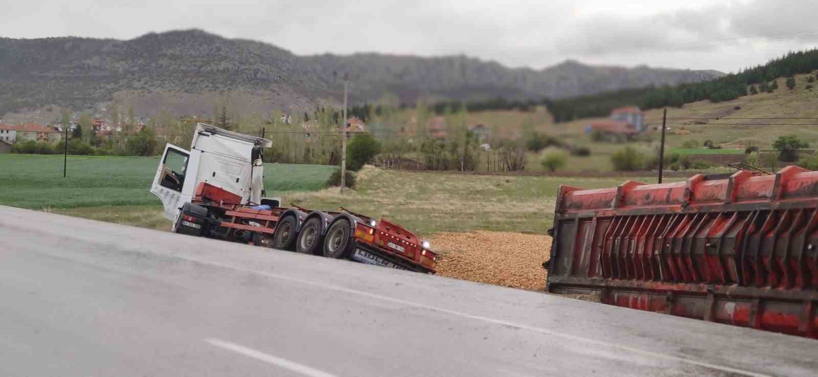 Afyonkarahisar’da şarampole girerek yan yatan talaş yüklü tırın sürücüsü yaralandı.