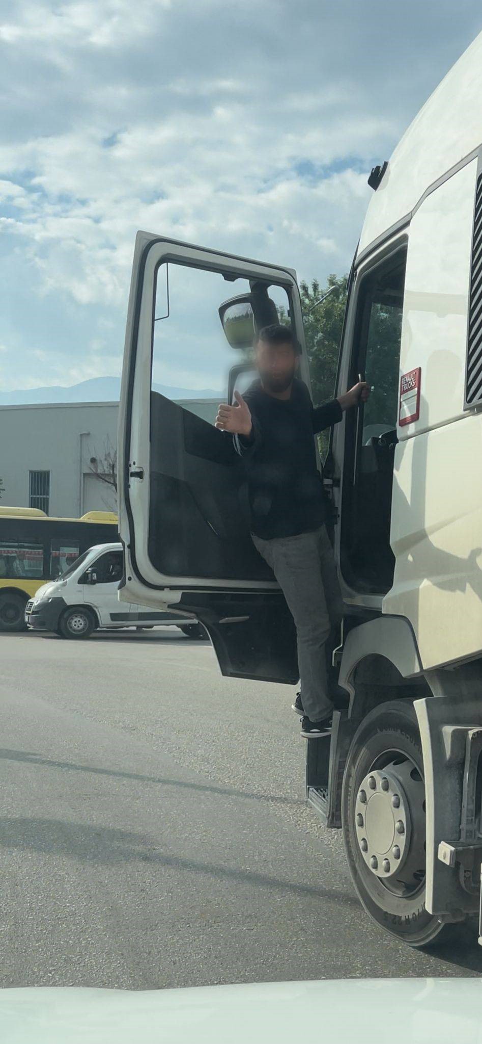 Bursa’da bir otomobil sürücüsü kavşağa hızla girdiği iddia ettiği tır sürücüsüyle tartışma yaşadı “Sen katil misin, nasıl bir hızla gidiyorsun?” diye tepki gösterdi. Tır sürücüsü trafikte aracından inip otomobil sürücüsünün üzerine yürüdü. Otomobil sürücüsü aracını kilitleyip o anları kayda aldı. Kavşakta duran tır sürücüsü aracına binerken el hareketi de yaptı.