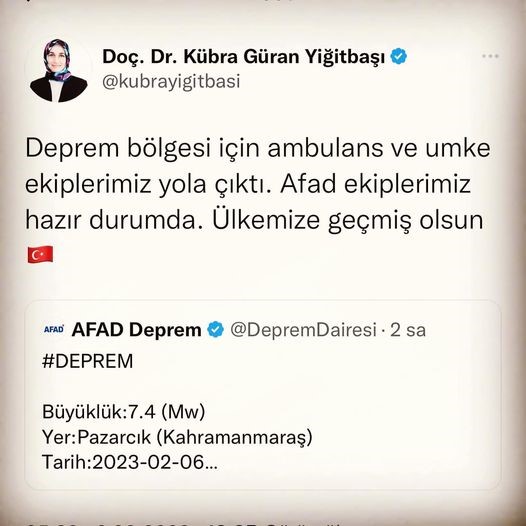 Afyonkarahisar Valisi Doç. Dr. Kübra Güran Yiğitbaşı, 7,4’lük depremin yaşandığı Kahramanmaraş bölgesine ambulans ve UMKE ekiplerinin gönderildiğini sosyal medya hesabından açıkladı.