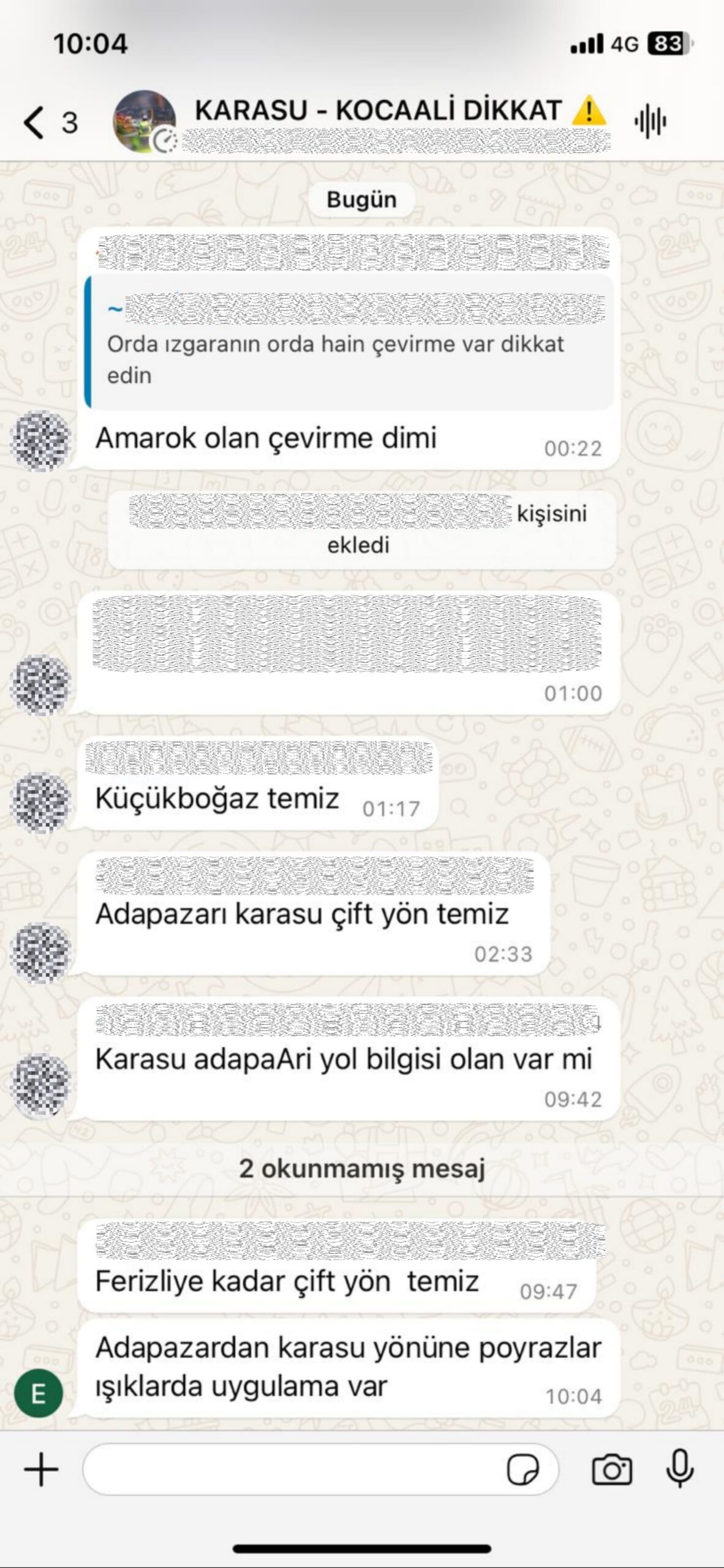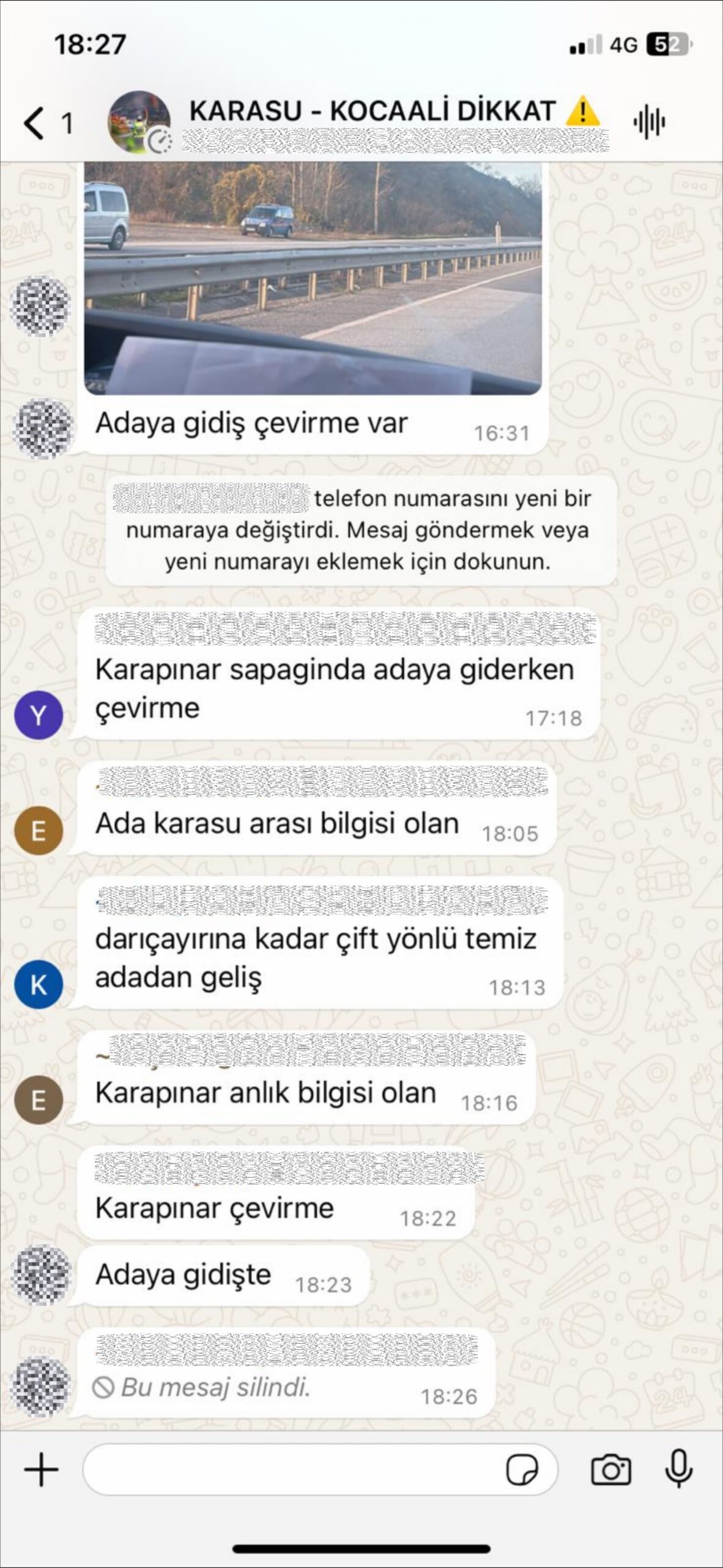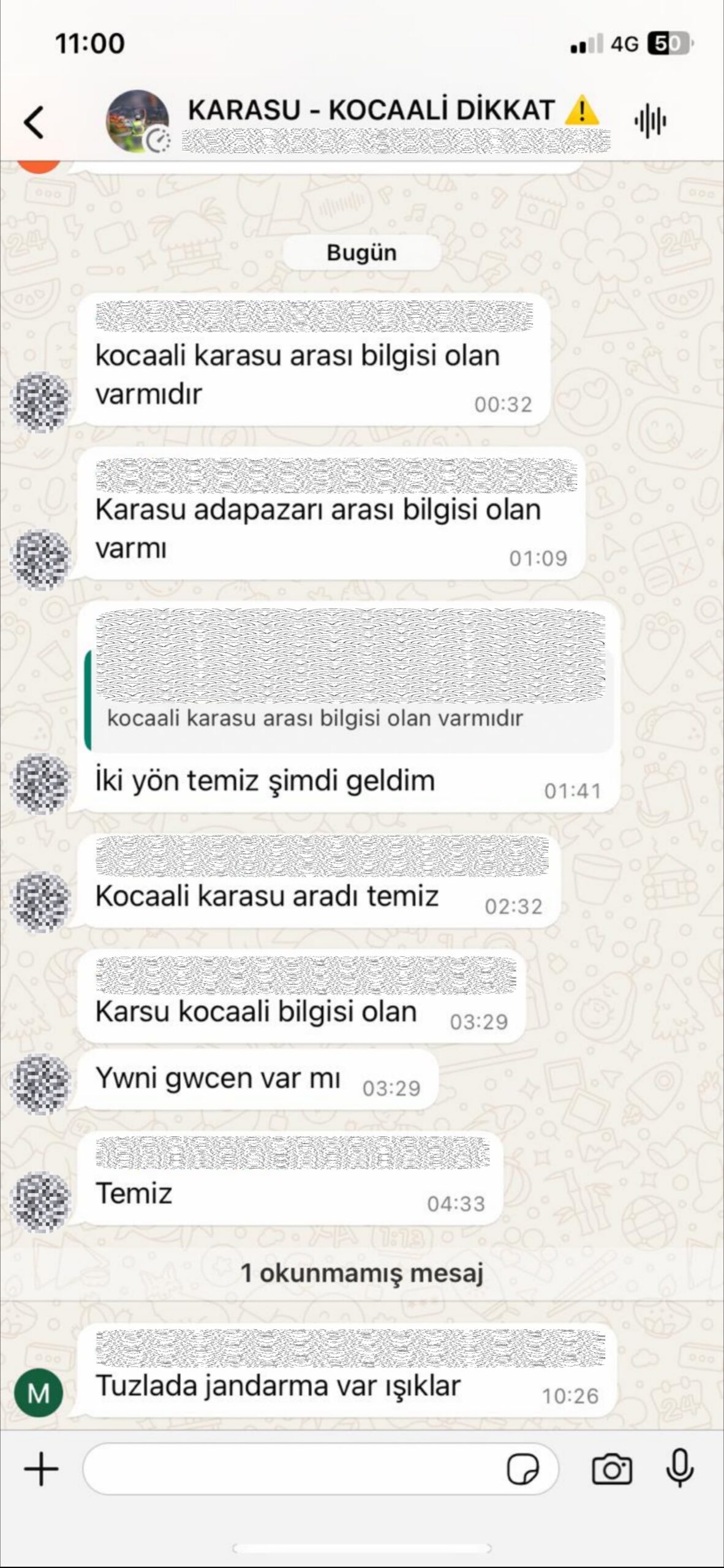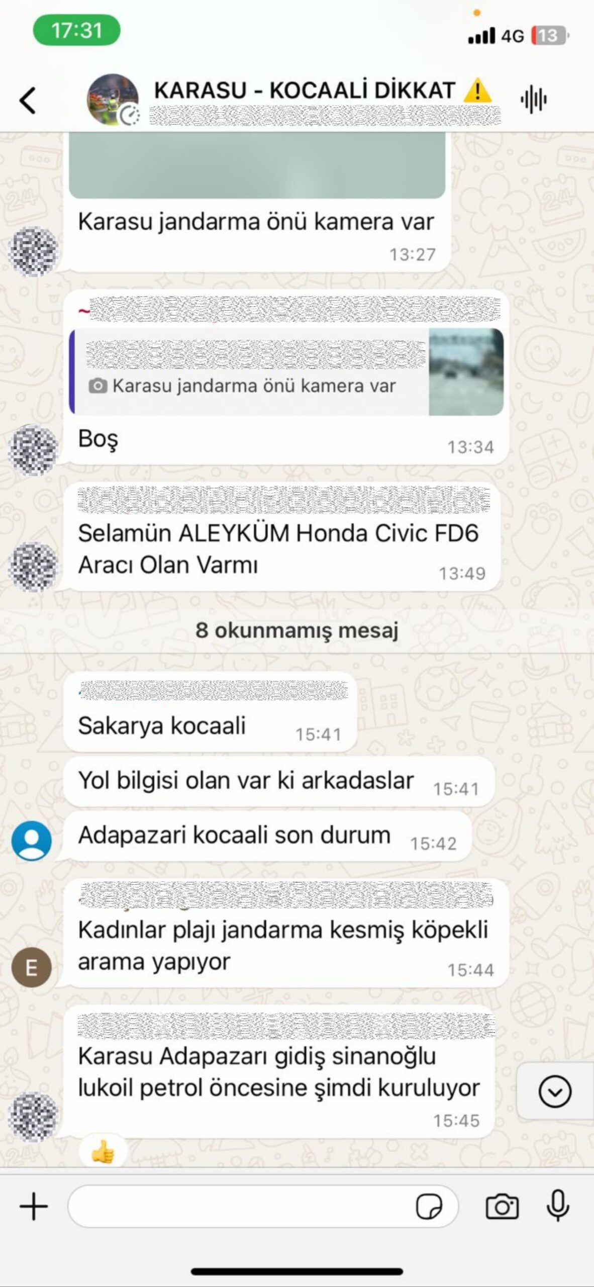 Sakarya İl Jandarma Komutanlığı ekipleri, kurulan bir WhatsApp grubunda jandarma ve polis uygulama noktalarının anlık olarak paylaşıldığı bilgisini aldı. Durumun üzerine harekete geçen ekiplerce yapılan çalışma neticesinde; 22 Şubat 2024 tarihinde kurulan WhatsApp grubunda Kocaali, Ferizli, Söğütlü ve Adapazarı ilçeleri gidiş-dönüş istikametinde D-650 kara yolu üzerinde kurulan jandarma ile polis uygulama noktalarının anlık olarak paylaşıldığını tespit edildi. 900 kişinin içerisinde bulunduğu ‘Kocaali-Karasu Dikkat’ isimli grup, jandarmanın başarılı operasyonu ile deşifre edildi. ‘Suçluyu Kayırma Suçu’ çerçevesinde başlatılan operasyonda grubun kurucusu ve yöneticisi A.E.P. (37), grubun diğer yöneticileri; E.Y. (37), İ.Ö. (35) ve H.Y. (35) isimli 4 şüpheli gözaltına alındı. Şahıslar jandarmadaki işlemlerinin ardından ‘Suçluyu Kayırma’ suçu ile sevk edildikleri mahkemede adli kontrol şartı ile serbest bırakıldı.