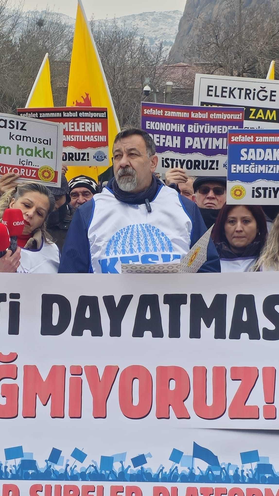 Basın açıklamasında tüm kamu emekçilerine çağrıda bulunan Karaaslan, “Hepimize dayatılan yoksulluğun ortağı olmamak için mücadele alanlarına, KESK’te örgütlenmeye çağırıyoruz” dedi.