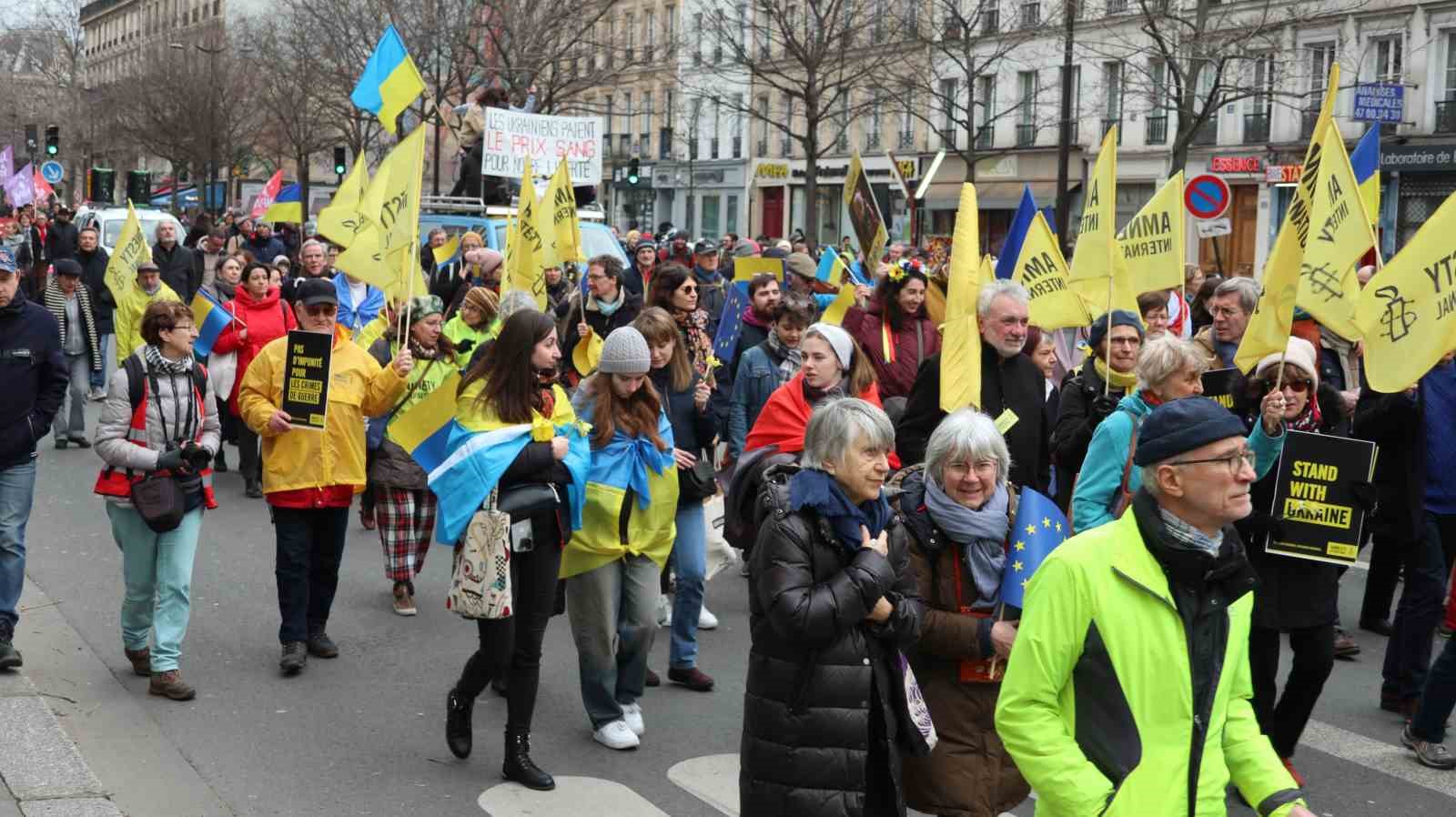 Fransa’da Ukrayna savaşının yıldönümünde gösteri düzenlendi. Başkent Paris’teki Cumhuriyet Meydanı’nda toplanan binlerce kişi Ukrayna’ya destek için Bastille Meydanı’na kadar yürüdü. Gösteride onlarca metre uzunluğunda Ukrayna bayrağı açarak yürüyen Ukrayna destekçileri, sık sık “Katil Putin” sloganı attı. “Zaferimiz kaçınılmaz” ve “Ukrayna için buradayız” pankartlarının açıldığı gösteride, Ukrayna’ya destek veren ülkelerin bayrakları da görüldü.