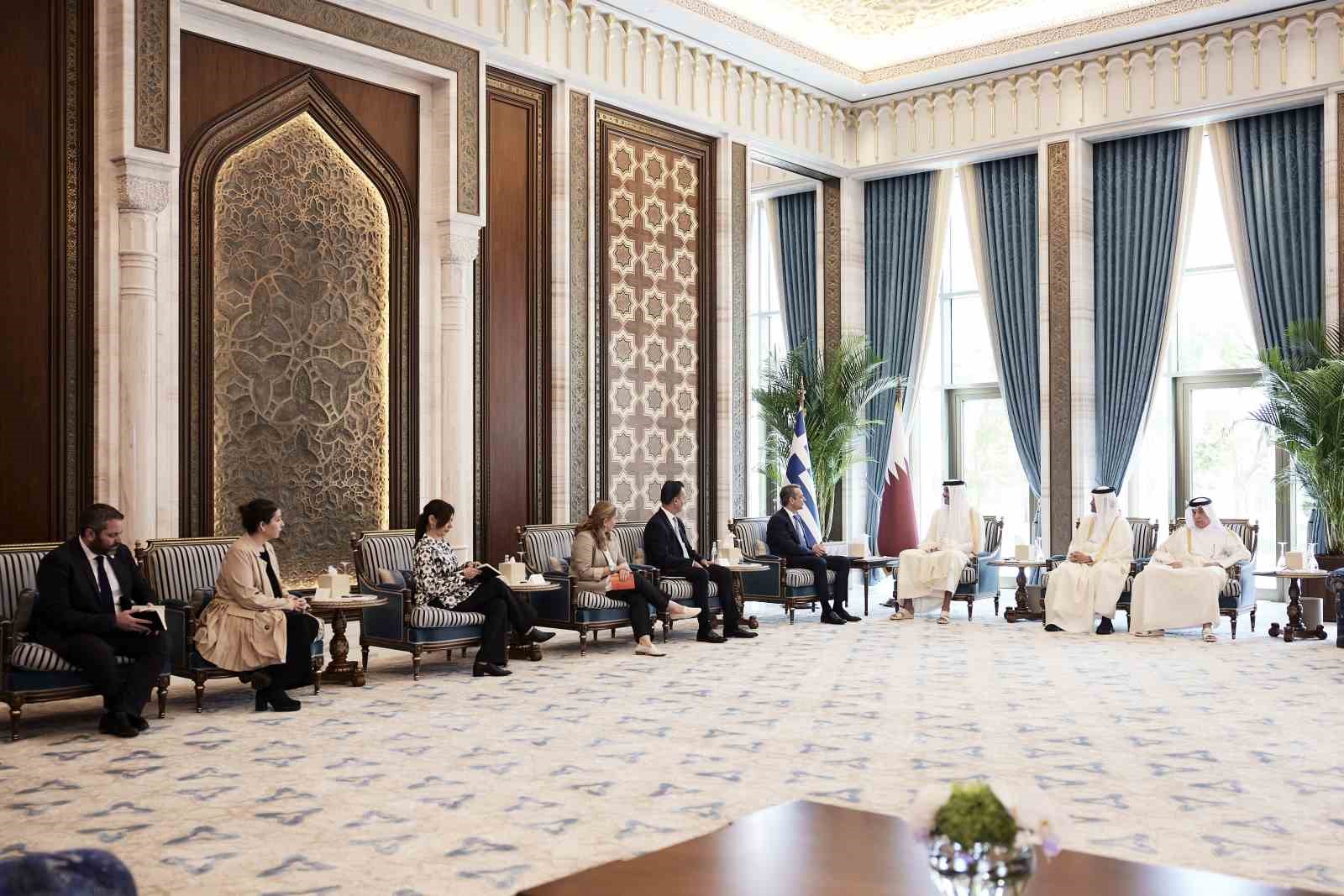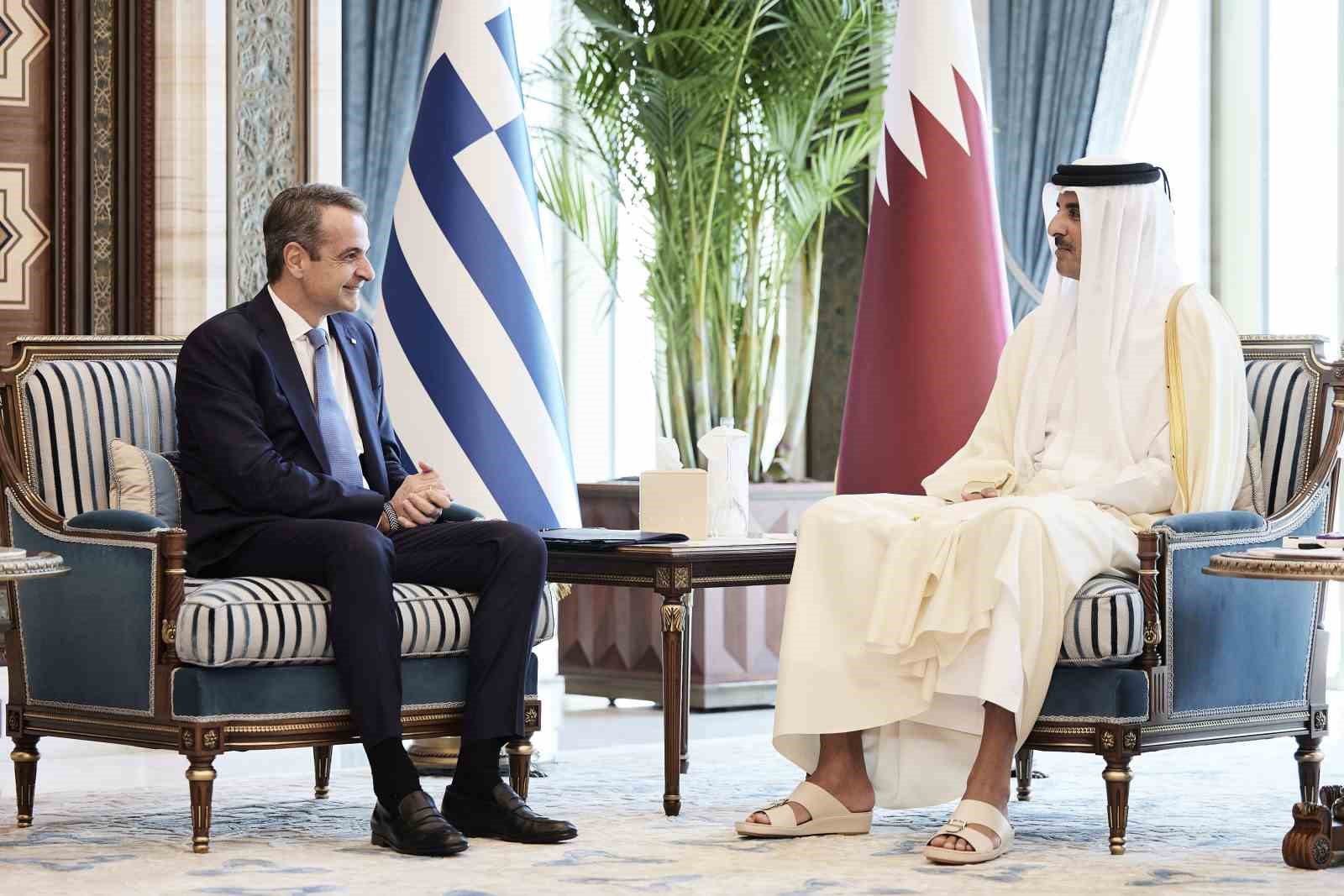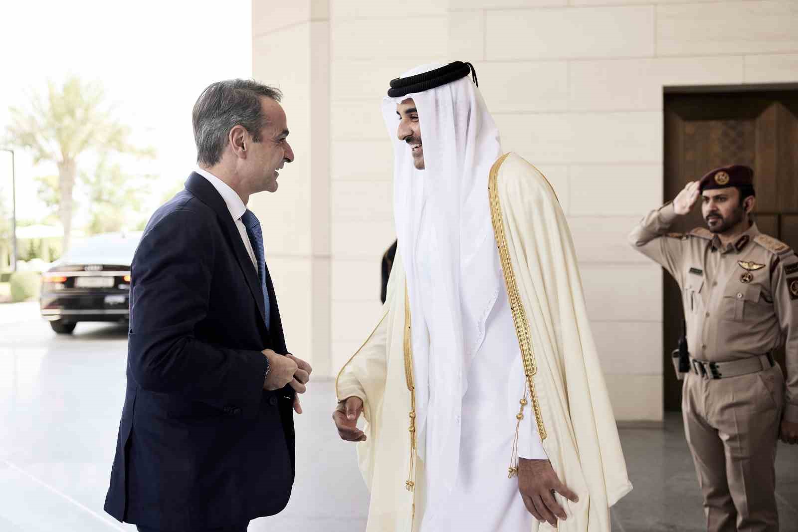 Yunanistan Başbakanı Kyriakos Miçotakis, Katar’ın başkenti Doha’da Katar Emiri Şeyh Tamim bin Hamad Al Thani ile bir araya geldi.