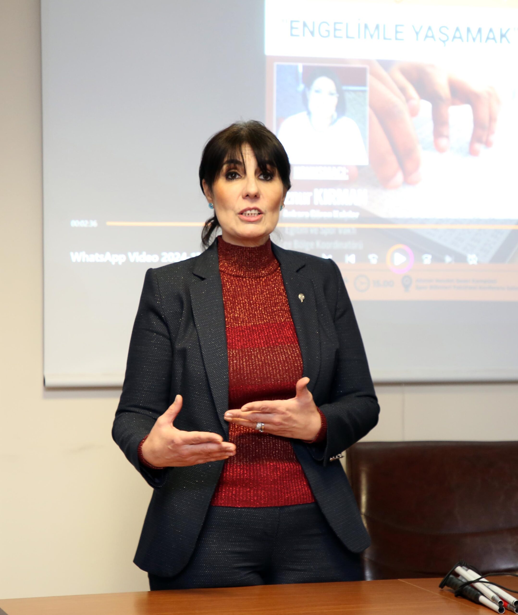 Açılış konuşmasının ardından Ankara Gören Kalpler Eğitim ve Spor Vakfı Ege Bölge Koordinatörü Öznur Kırman’ın “Engelimle Yaşamak” konulu söyleşisine geçildi. Engel kavramının insanlar için göreceli bir kavram olduğunu kaydeden Kırman, “Bizler toplumumuzda engelli birey tanımında ellerinde bir obje ya da tekerlekli bir sandalye veya baston olduğunda engelli birey olduğunu anlarız. Ben 2019 yılında bir rahatsızlık nedeniyle yüzde 90 görme engelliyim yüzde 10 gören bir kişiyim. Sadece sizin siluetlerinizi görebiliyorum” dedi.