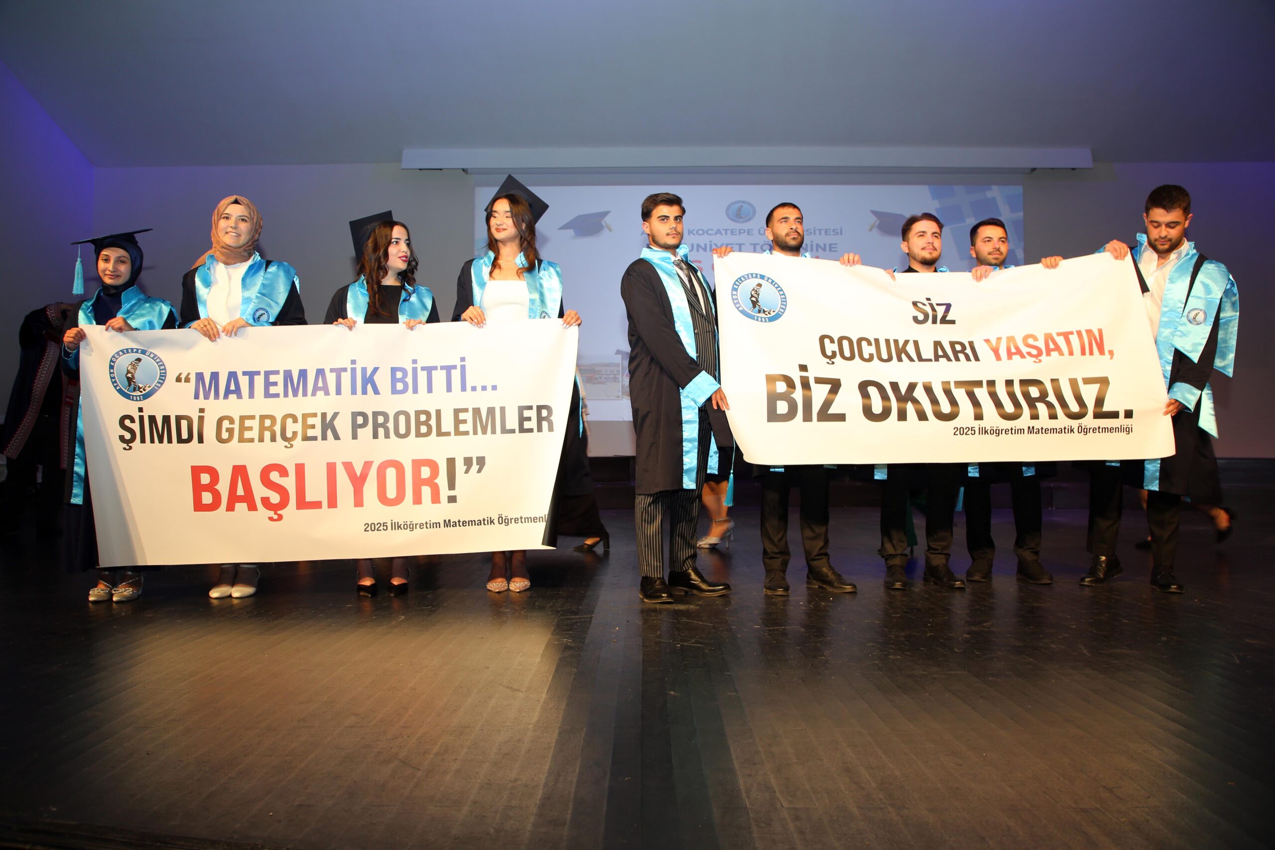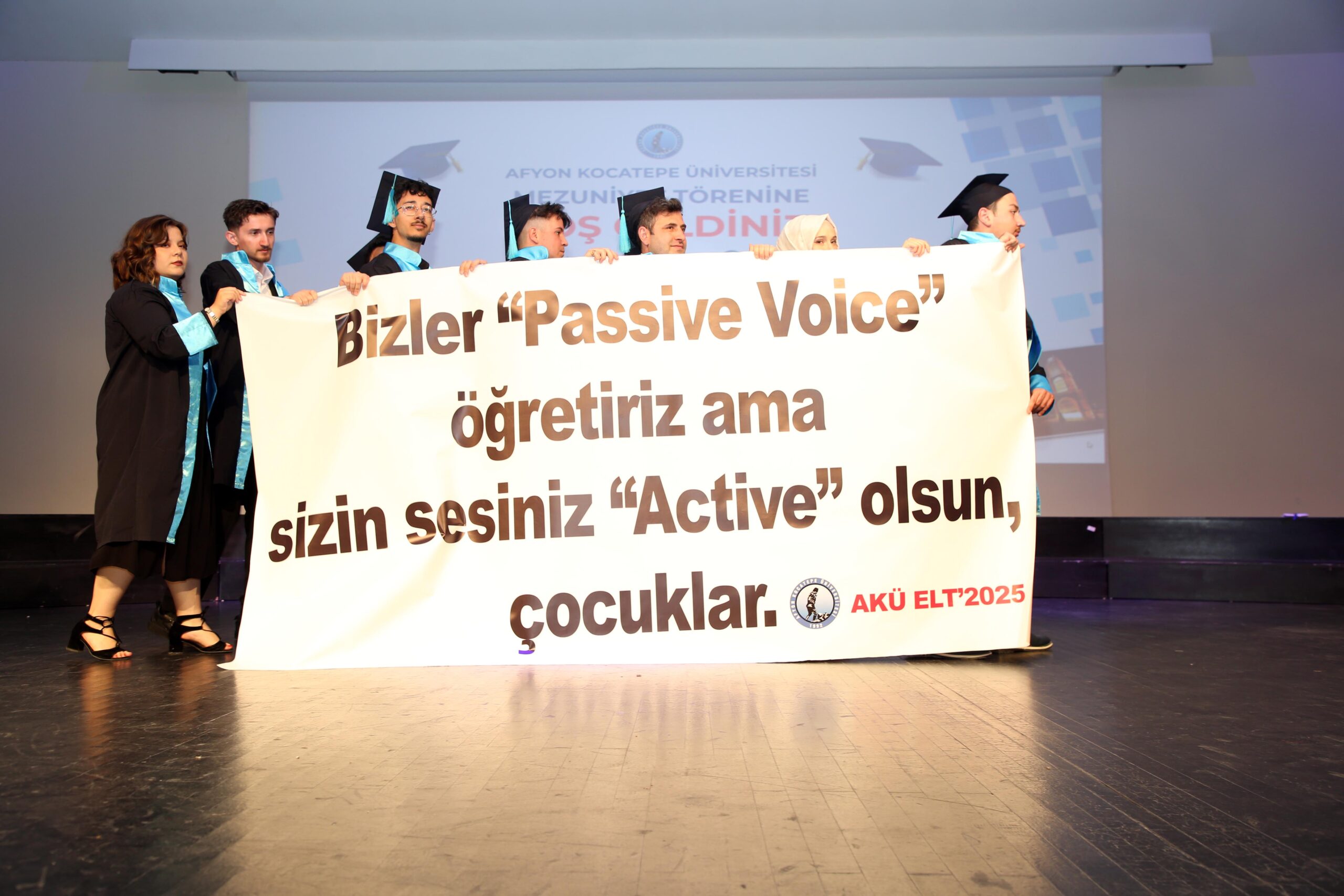 Afyon Kocatepe Üniversitesi (AKÜ) Eğitim Fakültesi 2024-2025 Akademik Yılı mezuniyet töreni gerçekleştirildi. Öğrencilerin pankartları dikkat çekti.