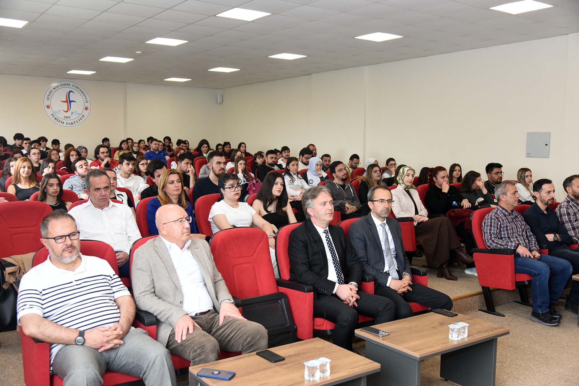 Reha Kora Konferans Salonunda düzenlenen konferansa; Turizm Fakültesi Dekanı Prof. Dr. Elbeyi Pelit, Gastronomi̇ ve Mutfak Sanatları Bölüm Başkanı Prof. Dr. Mustafa Sandıkcı ile birlikte öğretim elemanları ve öğrenciler katıldı.