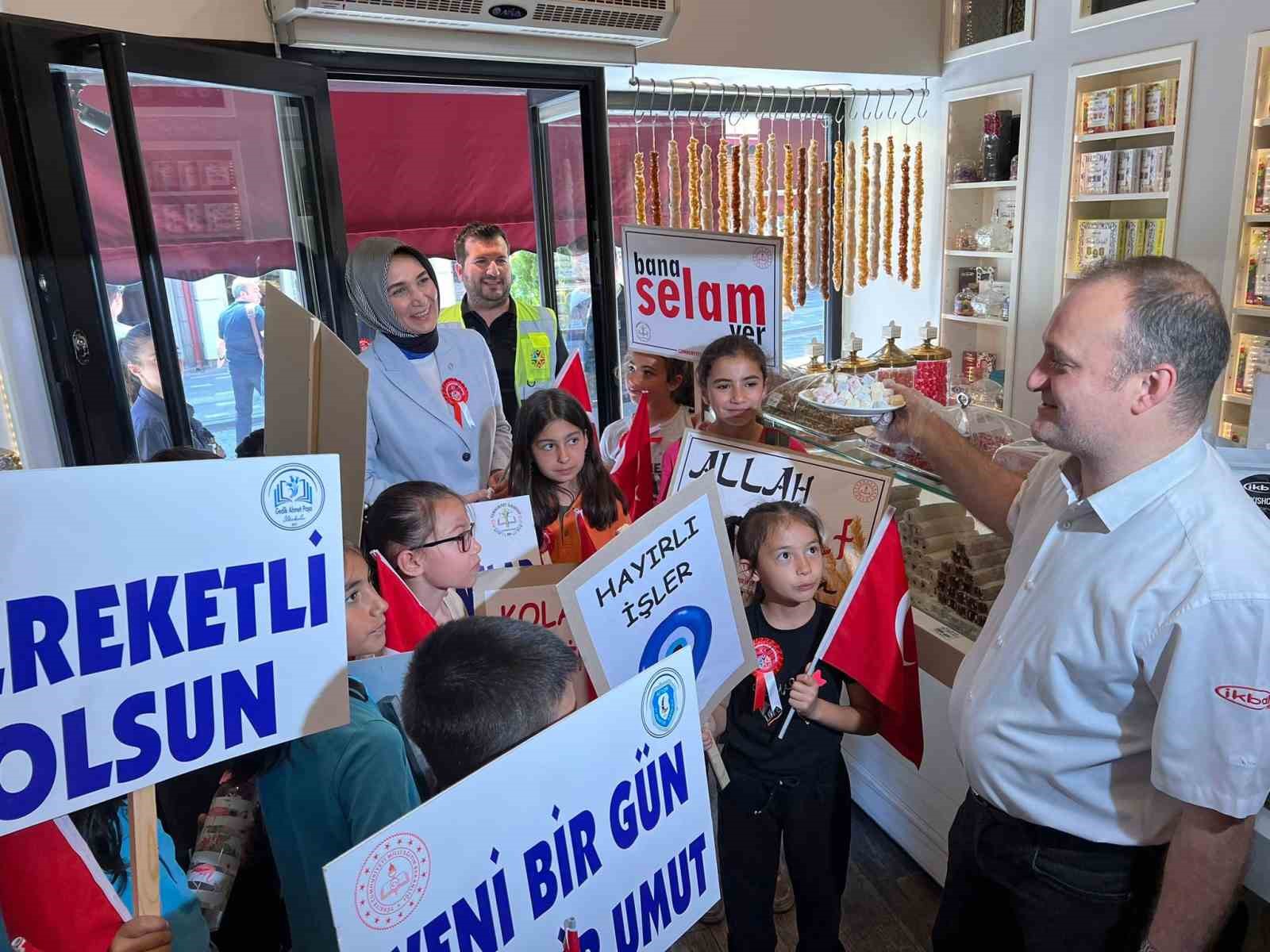 Afyonkarahisar Valiliği koordinesinde İl Milli Eğitim Müdürlüğü ve İyilik Hareketi Derneği işbirliğiyle gerçekleştirilen “Dünyaya Değer Katıyoruz” projesi çerçevesinde ilkokul öğrencileri Uzun Çarşı esnafını ziyaret ederek hayırlı işler diledi.