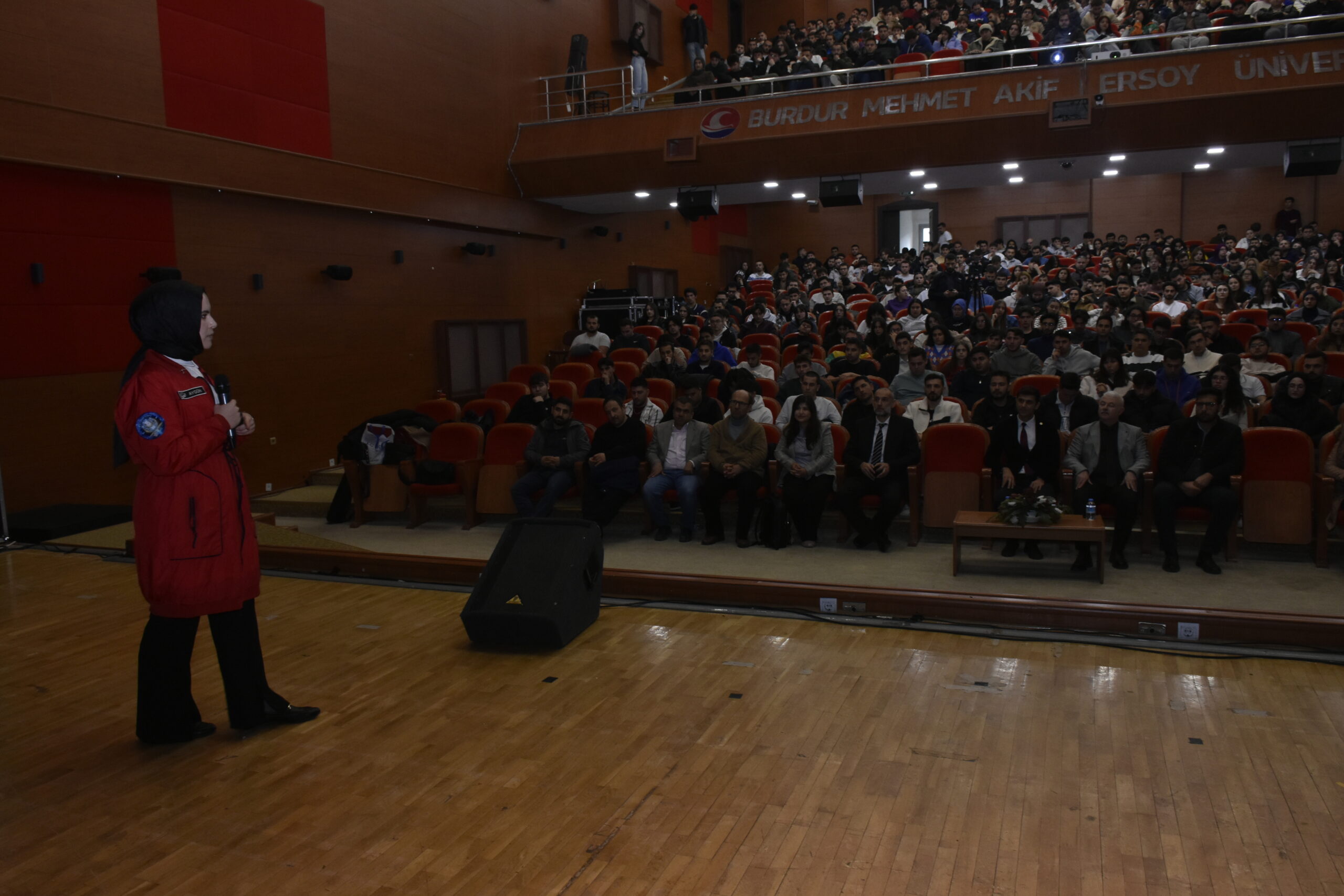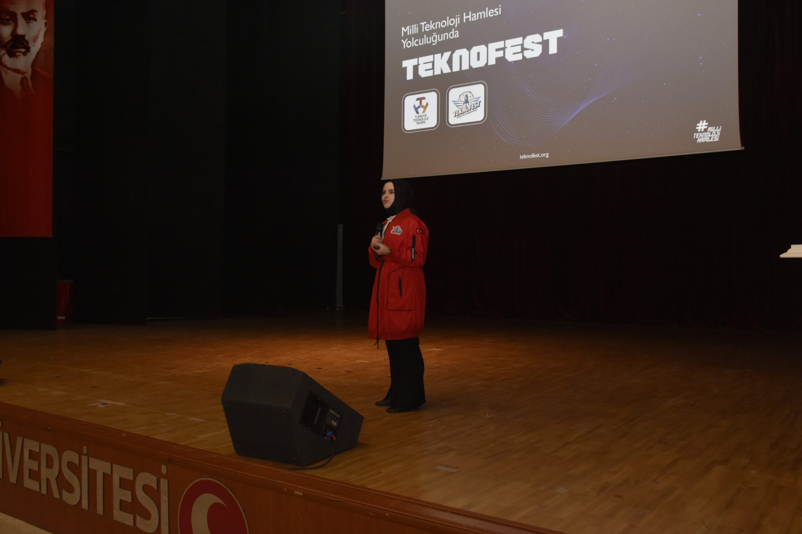 Etkinlikte daha sonra T3 Vakfı Burdur İl Sorumlusu Emine Büşra Aygün, TEKNOFEST hakkında bir konuşma yaparak katılımcılara yarışmalara katılım süreci ve proje geliştirme aşamaları hakkında bilgi verdi. Aygün, “Bir projeye başlamak için ilk olarak bir fikrinizin olması gerekir. Ardından, takımlarınızı oluşturmalı ve projeyi nasıl yöneteceğinizi planlamalısınız. Teknoloji Topluluğumuz ile bu süreci yönetebilirsiniz, biz her fakülteden öğrencilere yardımcı olmak için buradayız” dedi.