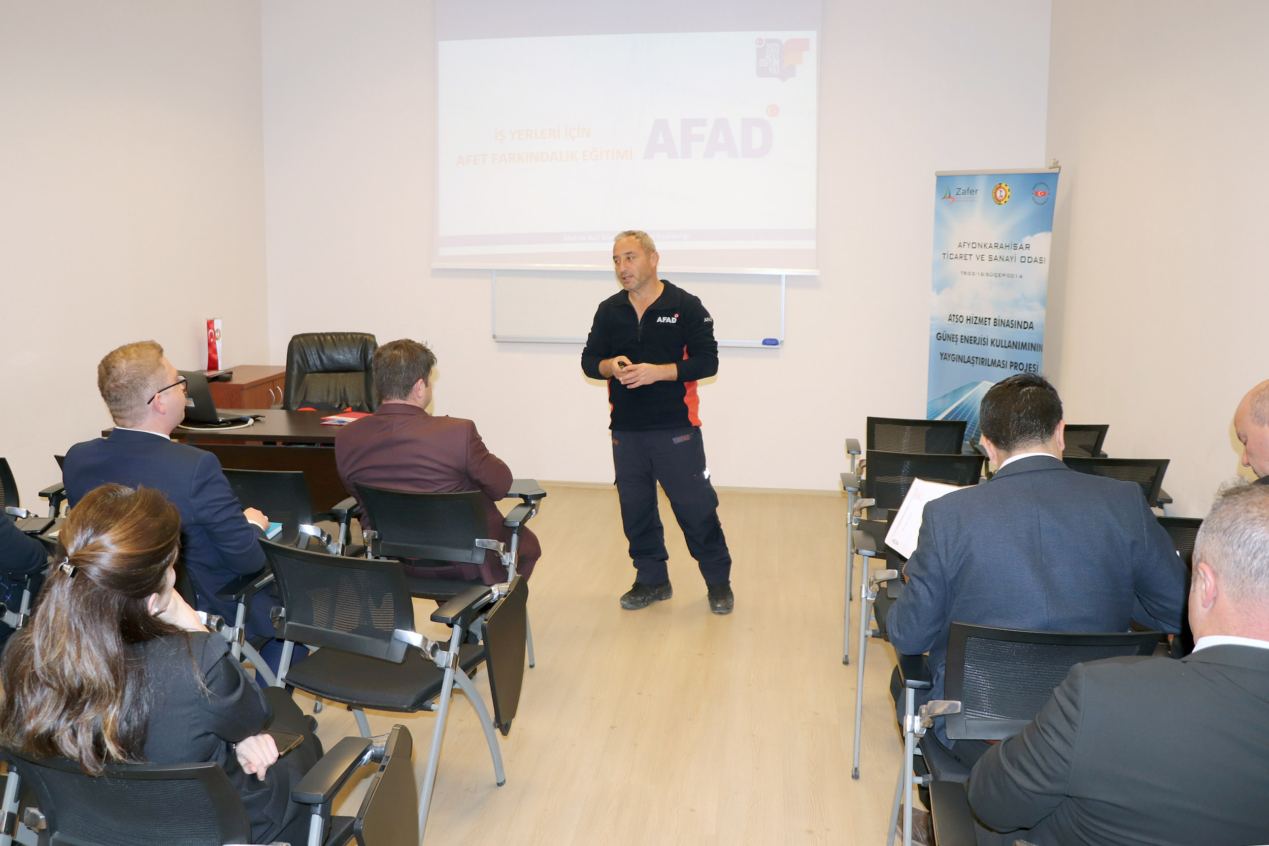 Afyonkarahisar İl Afet ve Acil Durum Müdürlüğü Arama Kurtarma Teknisyeni Hasan Açıkalın yangın, deprem, sel, teknolojik afetler gibi pek çok konuda ayrıntılı sunum yaptı. Açıkalın, afet durumlarına her zaman hazırlıklı olunması gerektiğini vurguladı. Yaklaşık iki saat süren eğitim dolayısıyla teşekkür eden ATSO Genel Sekreteri Ali Şenol, Türkiye Odalar ve Borsalar Birliği ile Afet ve Acil Durum Yönetimi Başkanlığı’nın işbirliği protokolü kapsamında sürdürülen “İşyerleri İçin Afet Farkındalık Eğitimi” çerçevesinde ATSO personelinin afetlere karşı farkındalığını artırdıklarını belirtti. Şenol, Açıkalın’a verdiği bilgiler dolayısıyla teşekkür etti.