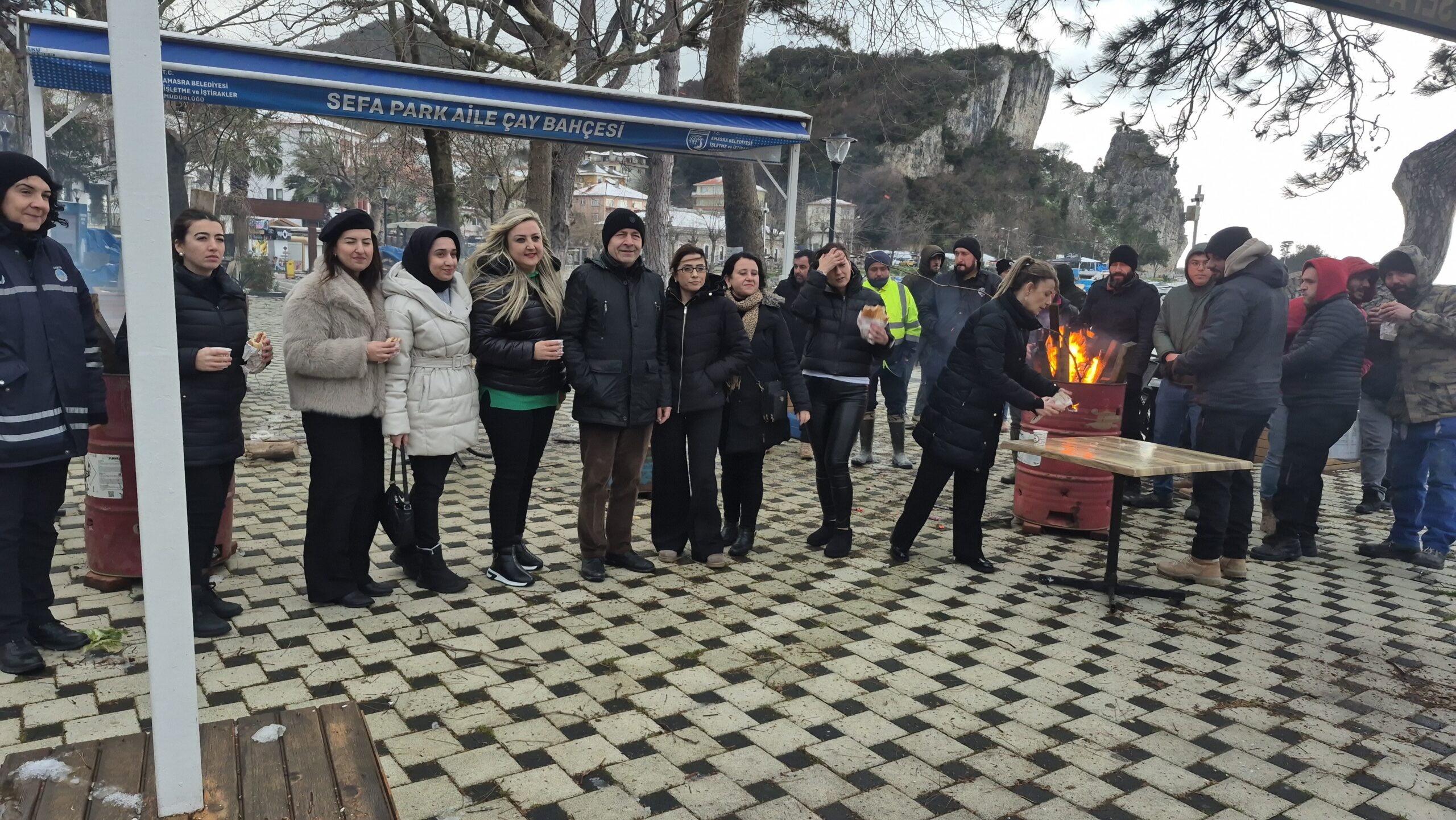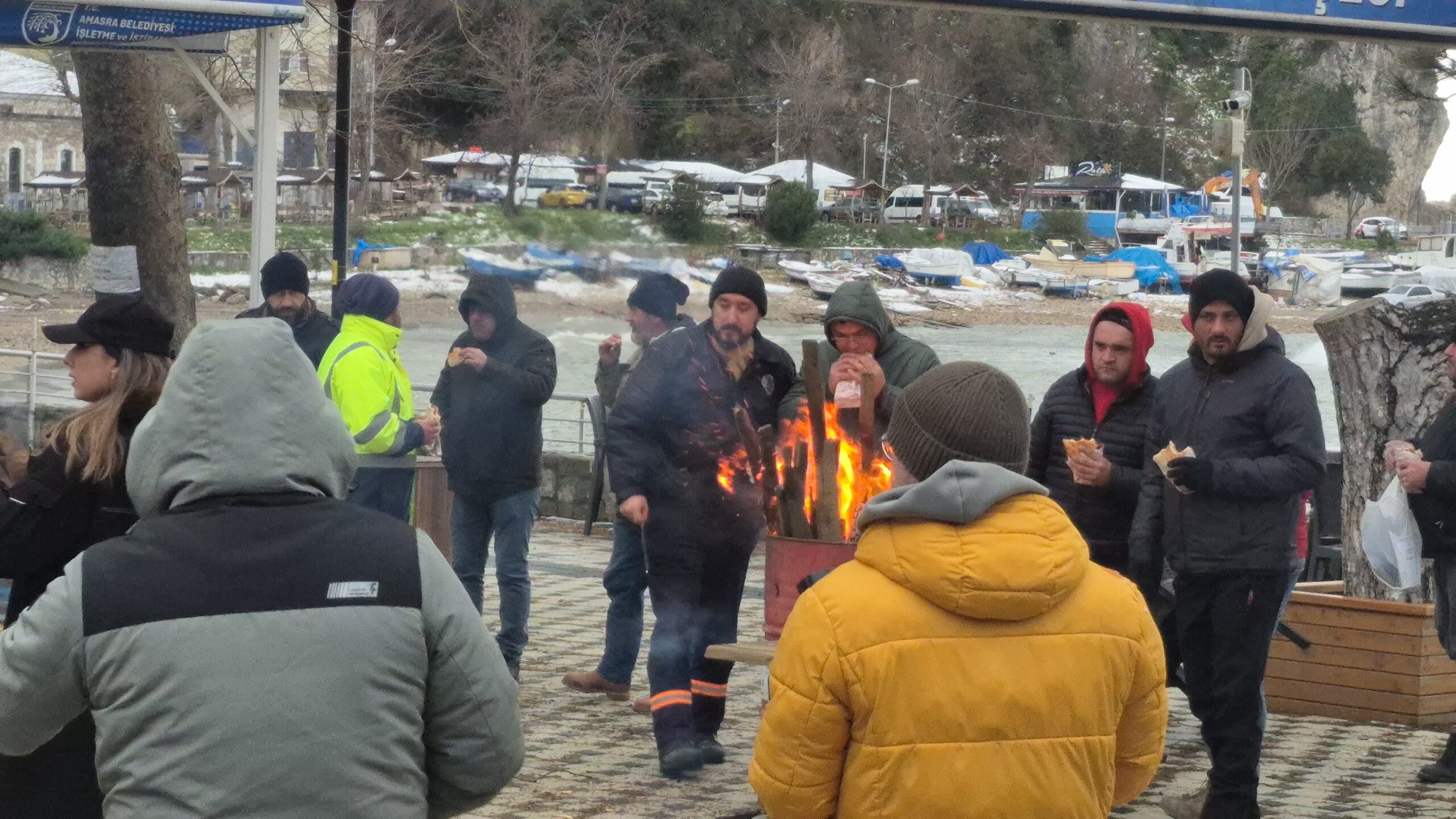 Bartın’ın Amasra ilçesinde başarılı bir karla mücadele çalışması yürüten belediye çalışanlarına Belediye Başkanı Recai Çakır sucuk ekmek ikram etti.