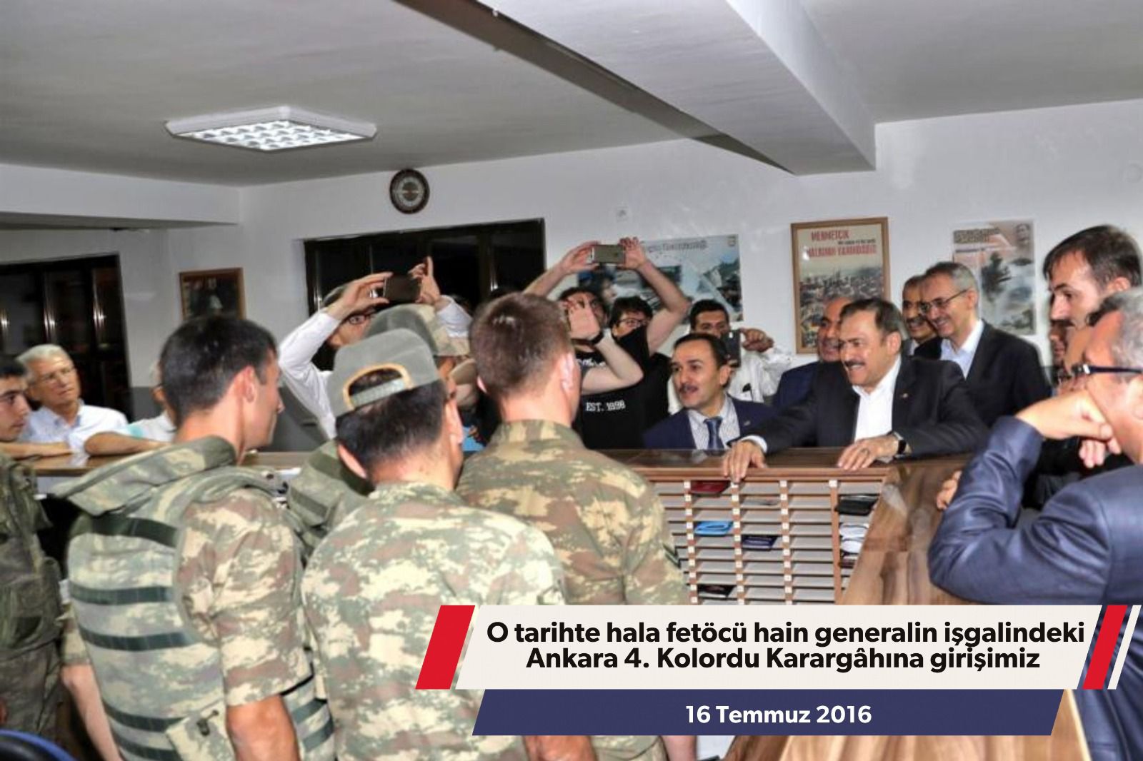 Akabinde Mamak 4. Kolordu Eşref Akıncı kışlasına geçtim. Devlet Su İşleri’nin dev iş makineleriyle kapatılmıştı. Çıkışa imkân verilmemişti. Oradan hiçbir zırhlı çıkamazdı. Orada her siyasi anlayıştan binlerce vatandaş kışlanın önünü doldurmuştu. Ben bir iş makinesinin üzerine çıkarak vatandaşlara hitap ettim. Sonra biz burada niçin bekliyoruz diye düşünerek, Kışlaya girmek üzere nizamiyeye yaklaştım. Yanımda müsteşarım Akif Özkaldı ve genel müdürlerim de vardı. Nizamiyede askerlerle selamlaştık. Çok dikkat çekici bir şey oldu. Askerler beni görünce şaşırdı. Metin Paşa nerede? diye sordum. Metin Paşamız yoktu ama oradaki komutan sanıyorum Fetöcü idi. Nizamiyeye bir üsteğmen geldi. Bana baktı bir şey söylemeden içeri geçti. Allah Allah dedim ben oradaki askerlerle sohbet ederken Metin Paşa’yı bekliyorum. 15-20 dakika sonra başka bir üsteğmen geldi. Dedi ki “Sayın Bakanım Metin Paşa yolda geliyor. Kendisi Akıncılar Hava Üssü’nde yolda. Siz beklemek isterseniz, arzu ederseniz içeri buyurunuz” diye söyledi.