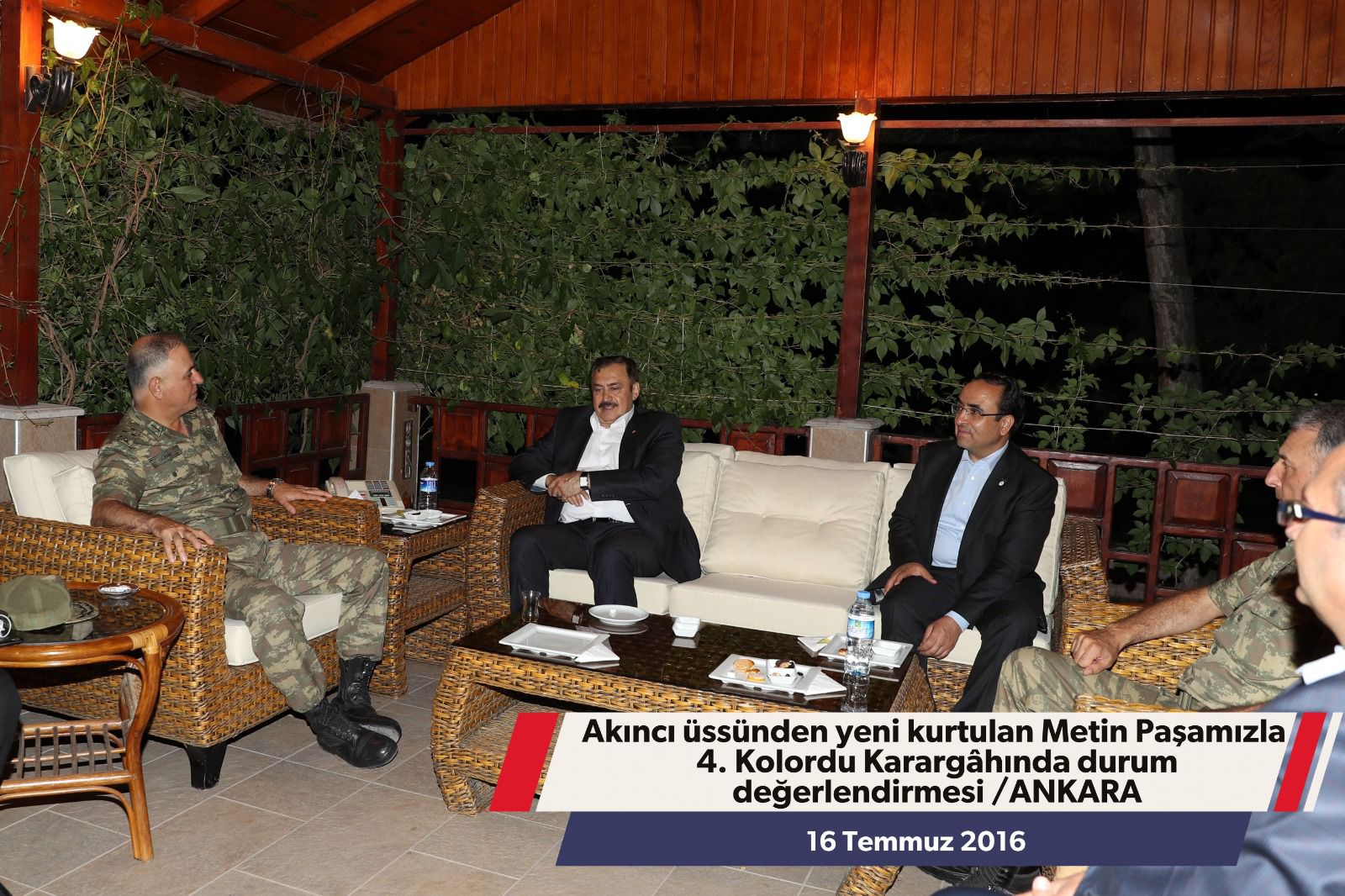 Karargâhta beklerken biraz sonra Metin Paşa geldi. Kucaklaştık. Metin Paşa’yı görünce çok sevindik. Metin Paşa anlattı. Cuma günü akşam saatinde valilikten aramışlar. Demişler ki “Genelkurmay Başkanlığı’nın binasının etrafında silah sesleri var.” Kendisi Garnizon Komutanı idi. 4’ncu Kolordu Komutanı aynı zamanda. Demiş ki ben o civardayım. Ve kendisi hemen Genelkurmay’a gitmiş. Fakat Genelkurmay’a gidince kapıdaki askerler içeri almamışlar. Kendisi bağırmış. “Ben garnizon komutanıyım. Açın kapıyı” diye. Arkadan bir subay kapıyı açın demiş. Kapıyı açar açmaz üzerine çullanmışlar ve bağlamışlar. Paşamızı doğruca Akıncılar Hava Üssü’ne götürmüşler. Bizim kışlaya girmemizden 20 dakika sonra kurtulmuş. Biz beklerken geldi. Epeyce sohbet ettik. Neler yaşandığını anlattı. Çok değerli bir komutan olan Sayın Metin Gürak Paşamız halihazırda Genelkurmay Başkanımızdır.