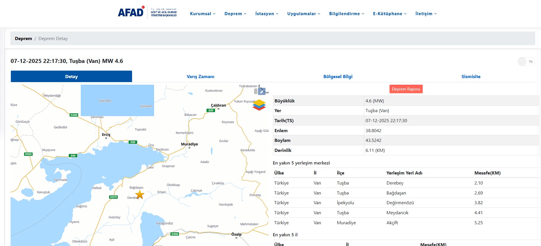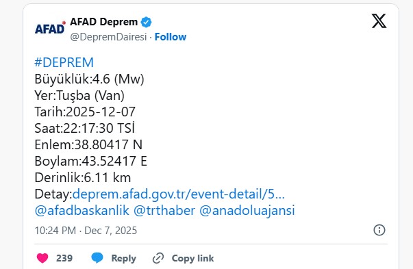 Afet ve Acil Durum Yönetimi Başkanlığı (AFAD), Van’ın Tuşba ilçesinde saat 22.17’de 4.6 büyüklüğünde deprem meydana geldiğini açıkladı. Deprem kısa süreli paniğe yol açtı ancak can kaybı ya da ciddi hasar bildirilmedi.