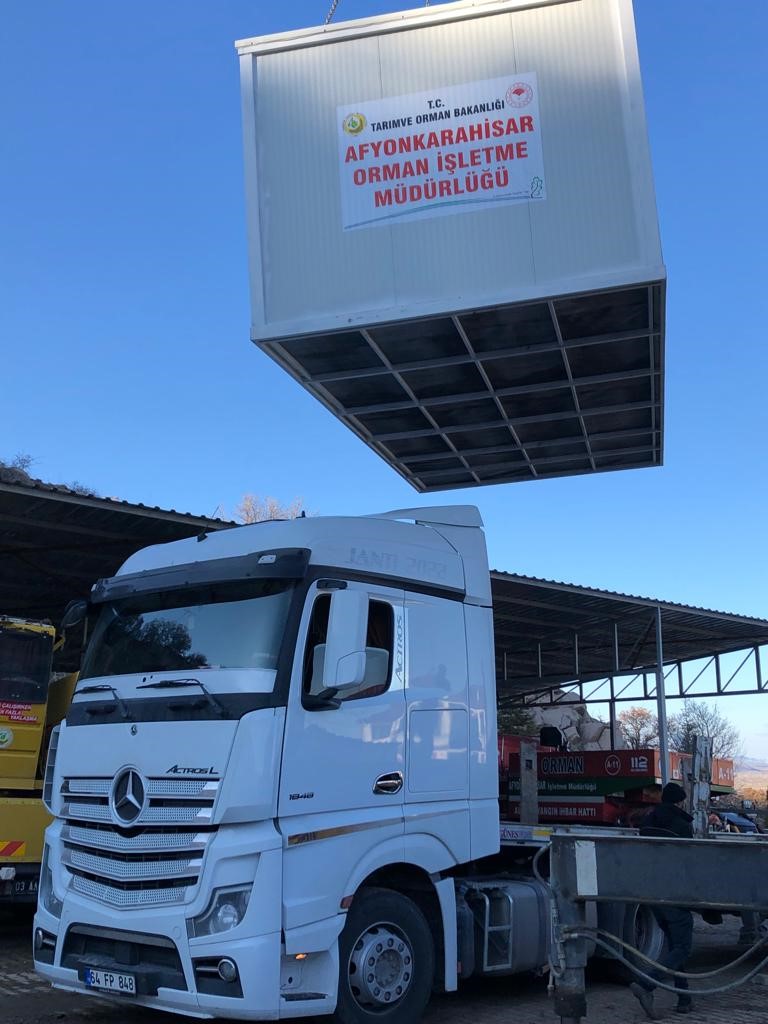 Kahramanmaraş merkezli meydana gelen depremlerin ardından, afet bölgesinde evleri yıkılan, hasar gören vatandaşların barınma ihtiyaçlarına yardımcı olmak için Eskişehir Orman Bölge Müdürlüğü’nde bulunan mevcut karavan ve konteynerler bölgeye sevk edildi. Sevkiyatın ardından Afyonkarahisar İşletme Müdürlüğünün Çakırköy’ de bulunan tamir atölyesinde 9 Şubat 2023 tarihinde konteyner üretimine geçildi. Bu kapsamda ihtiyaç duyulan malzemeler piyasadan uygun fiyatlara temin edilerek tamamen özgün tasarım ile imal edilen 2’si tuvalet olmak üzere 6 konteyner 14 Şubat tarihinde Kahramanmaraş’a ulaştırıldı. Konteynerlerin yola çıkarılmasına Orman Bölge Müdürü İsmail Çetin, Emirdağ Kaymakamı Osman Bilici, Afyonkarahisar Orman İşletme Müdürü Mustafa Gökhan Us, Afyonkarahisar Fidanlık Müdürü Mutlu Tepe ve atölye çalışanları da eşlik etti.