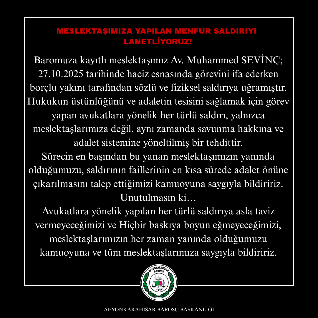 Afyonkarahisar Adliyesi önünde, meslektaşları Av. Muhammed Sevinç’e yönelik gerçekleştirilen saldırı ve son dönemde artan avukatlara yönelik şiddet olaylarıyla ilgili olarak Afyonkarahisar Barosu tarafından basın açıklaması yapıldı.