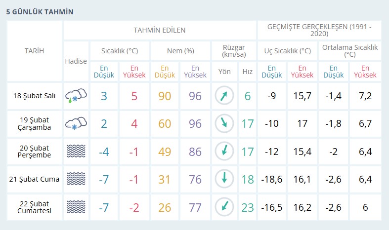 Meteoroloji’den alınan 5 günlük verilere göre Afyonkarahisar’da soğuk hava kapıya dayandı. Bugün en yüksek 5 derece beklenirken, çarşamba günü düşüş devam edecek. Perşembe günü ise sıcaklıklar sıfırın altına düşecek ve hafta sonu hava sıcaklıkları sıfırın altında seyredecek.