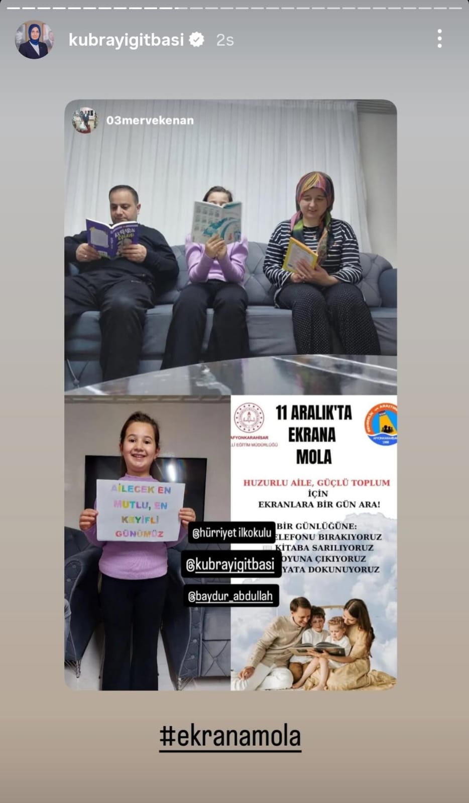 Proje kapsamında yüzlerce vatandaş, çocuklarıyla birlikte telefon ve tabletleri bir kenara bırakıp kitap okudu, oyun oynadı ve kaliteli zaman geçirdi. Aileler gün boyunca yaşadıkları bu keyifli anları sosyal medya hesaplarında paylaşarak hem Afyonkarahisar Valisi Doç. Dr. Kübra Gürhan Yiğitbaşı’nı, hem İl Milli Eğitim Müdürü Miraç Sünnetçi’yi hem de Afyonkarahisar Valiliği’ni etiketledi.