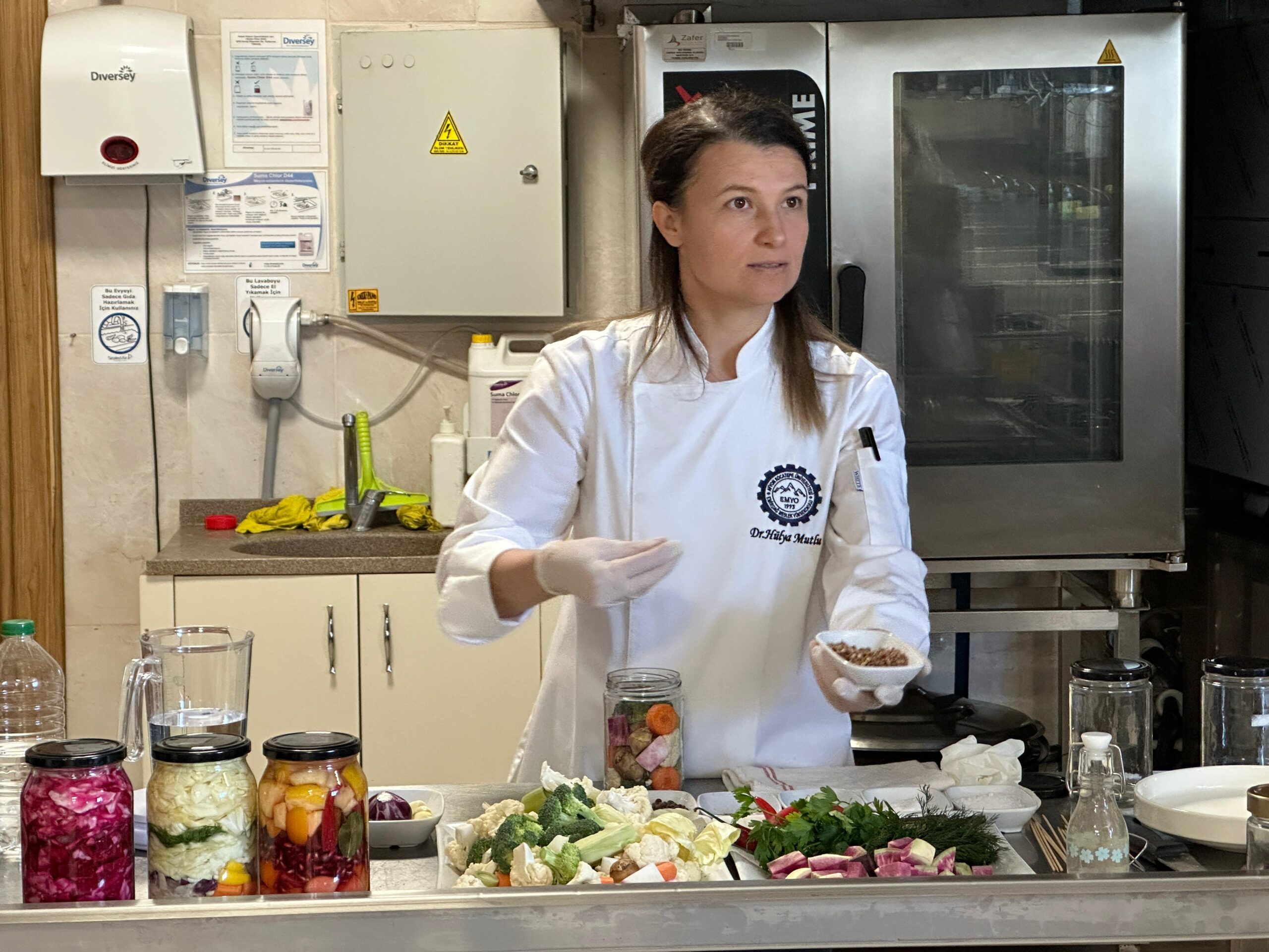 Doktor Öğretim Üyesi Hülya Mutlu tarafından verilen eğitimde, fermantasyon sürecinin temel kuralları ve dikkat edilmesi gereken püf noktaları paylaşıldı. Mutlu, özellikle salamura hazırlığında suyun dinlenmiş ve soğuk olması gerektiğini vurgulayarak, sıcak su kullanımının faydalı bakterileri yok edeceğini belirtti.
