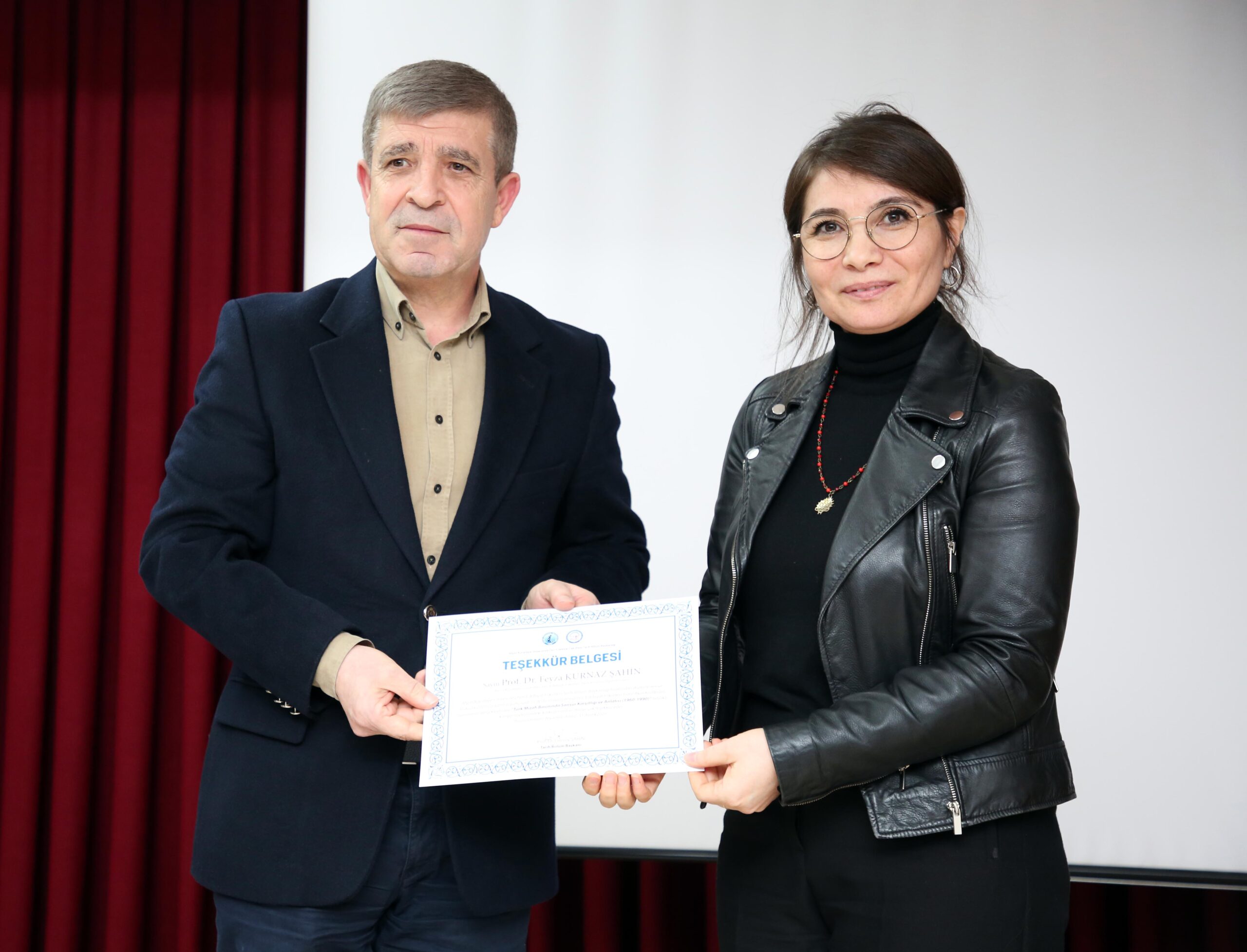 1960-1990 Dönemi Mizah Basınının genel karakteristiğini değerlendiren Şahin, “1960–1990 dönemi karikatürleri incelendiğinde, ele alınan temaların başında sınıfsal ayrışmanın geldiği görülmektedir. Karikatürlerde özellikle orta sınıfın gündelik sorunları yoğun biçimde işlenmiştir. Kömür bulamama, kömür taksitlerini ödeme güçlüğü, gecekondulaşma ve köyden kente göç, bu dönemin öne çıkan temaları arasındadır.1960’lı yıllarla birlikte, özellikle Demokrat Parti döneminde şehir nüfusunun hızla artması sonucu köyden kente göç eden yeni tipolojiler ortaya çıkmıştır. ‘Kömürcü Şevket’, ‘Kahveci’ gibi figürler bu sürecin simgesel örnekleridir” şeklinde konuştu. Karikatürlerde aynı zamanda, köyden kente göçle birlikte ortaya çıkan yeni bir toplumsal ve ahlaki düzen tartışmasının da yer aldığını kaydeden Şahin, “Ne tam anlamıyla şehirli ne de köylü olan, gecekondu bölgelerinde yaşayan ve iki kültür arasında sıkışmış bu yeni tipolojiler, ahlaki çözülme ve uyum sorunları üzerinden temsil edilmiştir. Bunun yanı sıra sınıfsal farklılıklar, siyasal eleştiriler ve gelir dağılımındaki adaletsizlikler de karikatürlerin temel anlatı unsurları arasında yer almıştır. Aile yapısına ilişkin temalar da bu dönemde dikkat çekicidir” diye konuştu. Şahin, sansürün rejimlerden ve iktidarlardan bağımsız bir pratik olarak algılandığını söyleyerek, “II. Abdülhamid döneminde sansür, daha çok bürokratik bir rutin ve memur pratiği şeklinde işlerken; Cumhuriyet döneminde, özellikle televizyon ve sinemanın yaygınlaşmasıyla birlikte, sansürün daha mekanize, daha kurumsallaşmış ve daha yıkıcı bir hâl aldığına dair güçlü bir eleştiri üretilmiştir. Sonuç olarak, Cumhuriyet döneminde sansür, medya alanlarının çoğalmasıyla birlikte daha yaygın ve daha yıkıcı bir biçim kazanmıştır. Ancak tüm bu temsillerden çıkarılabilecek en temel sonuç, mizah basınının sansürü, iktidarlardan bağımsız ve tarihsel olarak kesintisiz bir olgu olarak ele aldığıdır. Bu süreklilik vurgusu, mizah basınının sansür karşıtı anlatısının temelini oluşturmaktadır” dedi. Konferans, soru cevap bölümün ardından teşekkür belgesi takdimi ile sona erdi.