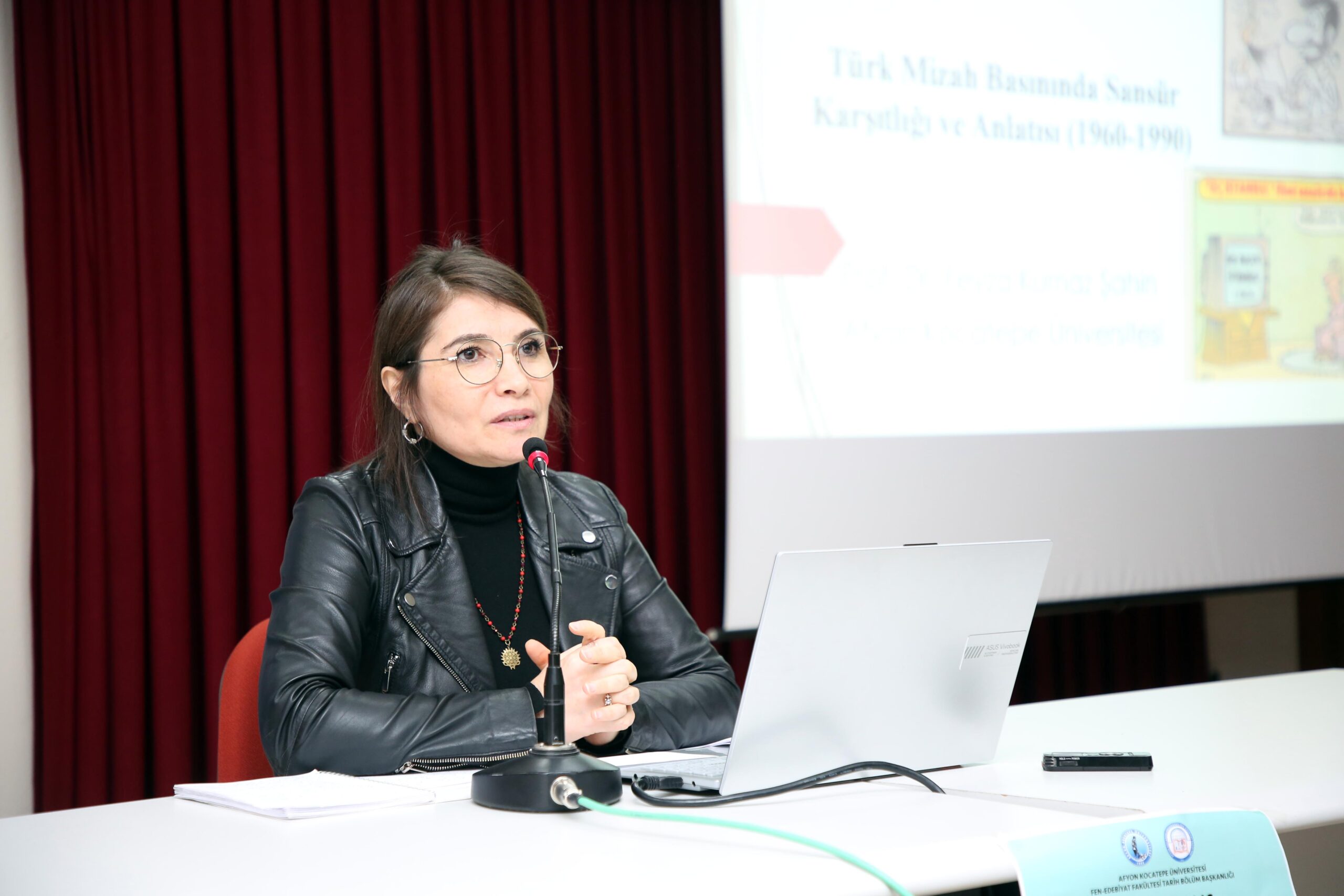 “Türk Mizah Basınında Sansür Karşıtlığı ve Anlatısı (1960-1990)” başlıklı sunumu yapan Tarih Bölümü Öğretim Üyesi Prof. Dr. Feyza Kurnaz Şahin, mizahın yalnızca gülme eylemiyle sınırlı bir gülmece olmadığını, mizahın temel perspektifinin; rahat olanları rahatsız etmek, rahatsız olanları ise rahatlatmak amacıyla üretilmesi olduğunu belirtti. Şahin, “Bu yönüyle bakıldığında, Türk mizah basını son derece zengin bir birikime sahiptir. Ancak mizahı yalnızca basınla sınırlamak doğru değildir. Sözlü mizah geleneğimiz çok daha eski dönemlere uzanmaktadır. Nasrettin Hoca, bu geleneğin en önemli tipolojilerinden biridir. Bunun yanı sıra Keloğlan anlatıları ve Dede Korkut hikâyelerindeki temalar da sözlü mizahımızın temel örnekleri arasında yer almaktadır” dedi. Yazılı mizahın tarihi hakkında bilgiler veren Şahin, “Osmanlı döneminde bu alanın başlangıcı, Şinasi’nin Şair Evlenmesi adlı eserinin Tercüman-ı Hakikat gazetesinde tefrika edilmesiyle ilişkilendirilmektedir. Bu süreçle birlikte yazılı basında mizah ortaya çıkmaya başlamış, çeşitli dergilerin mizah ekleri yayımlanmış ve dönemin siyasal atmosferi ile toplumsal sorunları mizah yoluyla ifade edilir hâle gelmiştir” diye konuştu.
