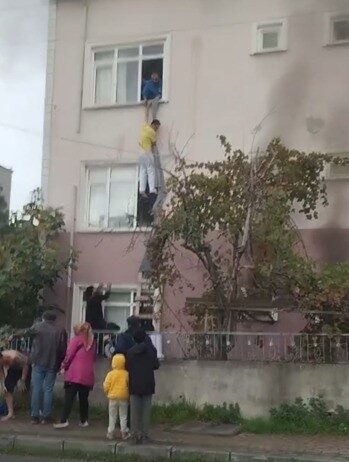 Kocaeli’nin Darıca ilçesinde alacağını tahsil edemediğini iddia eden şüpheli, önce kendisine müdahale etmeye çalışan arkadaşlarına bıçak çekti ardından 30 işçinin kaldığı binanın giriş katındaki daireyi ateşe verdi. 4 işçinin dumandan etkilendiği yangında, binada mahsur kalan işçilerin birbirine bağladıkları çarşaflarla pencerelerden aşağı inerek kurtuldukları anlar kameraya yansıdı.
