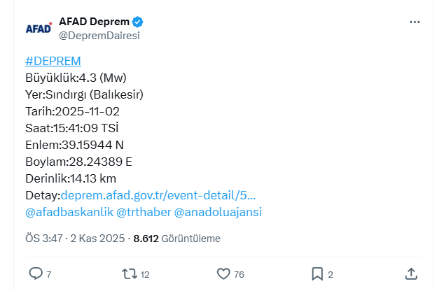 AFAD’dan yapılan açıklamada, Sındırgı merkezli depremin 4.3 şiddetinde olduğu belirtildi.