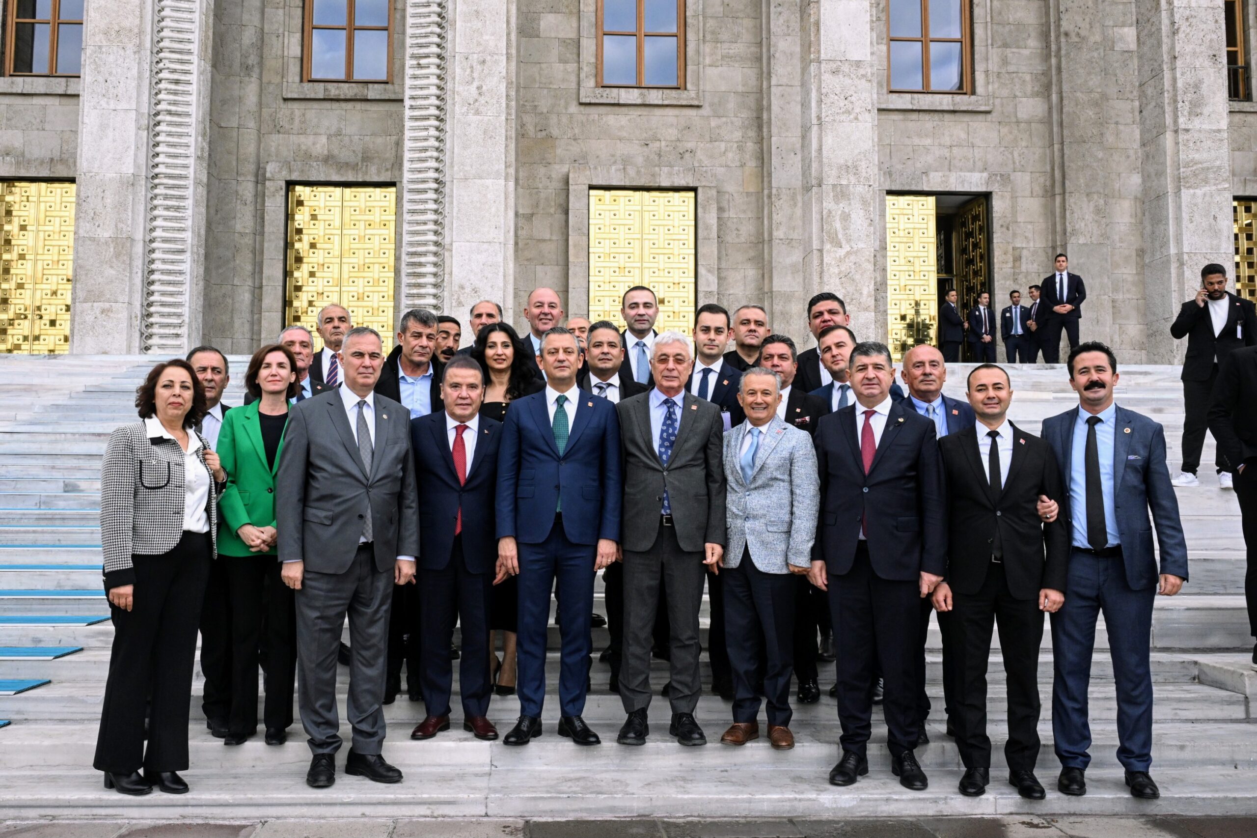 Özel, Başkan Muhittin Böcek ve Antalya heyetiyle birlikte meclisin önünde hatıra