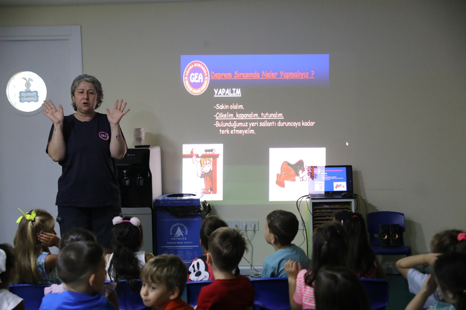 Antalya Büyükşehir Belediyesi Deprem Risk Yönetimi Şube Müdürlüğü personeli ile Birleşmiş Milletler’e bağlı INSARAG üyesi olan ve AFAD tarafından akredite edilmiş GEA Sivil Toplum Kuruluşu üyesi uzman eğitmen eşliğinde kreşler de öğrenim gören öğrencilere deprem hakkında anlaşılır bilgiler aktarıldı. Eğitmenler, çocuklara, deprem anında ne yapmaları gerektiği, güvenli alanlara nasıl ulaşacakları ve acil durumlarda nasıl davranacakları konusunda önemli bilgiler verdiler. Bilgilendirme sonunda, Deprem Risk Yönetimi Şube Müdürlüğü tarafından akılda kalıcılığı sağlamak üzere çocuklara pedagojik materyaller dağıtıldı.