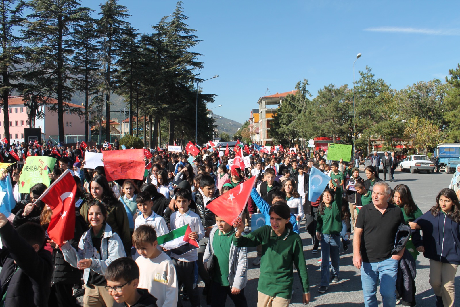 Afyonkarahisar’ın Çay ilçesinde, Çay Kaymakamlığının öncülüğünde ve Milli Eğitim Bakanlığı Din Öğretimi Genel Müdürlüğü koordinasyonunda yürütülen ÇEDES (Çevreme Duyarlıyım, Değerlerime Sahip Çıkıyorum) Projesi kapsamında anlamlı bir etkinlik gerçekleştirildi. “Bayrağını Al, İnsanlık İçin Zulme Dur De” sloganıyla düzenlenen yürüyüşe, 1.300’ü aşkın gönüllü öğrenci, öğretmen, veli, ilçe protokolü, sivil toplum kuruluşları ve vatandaşlar katıldı. Çay İlçe Milli Eğitim Müdürlüğü tarafından organize edilen etkinlik, Kaymakamlık binası önünden başlayarak Cumhuriyet Caddesi boyunca devam etti ve Dörtyol Meydanı’nda sona erdi. Katılımcılar, yürüyüş boyunca Türk, Filistin ve Doğu Türkistan bayrakları taşıyarak dayanışma mesajı verdi. Öğrenciler ayrıca kendi hazırladıkları pankartlar ve “Kardan Aydınlık” şarkısı eşliğinde yürüyerek, dünyadaki adaletsizliklere dikkat çekti. Programın sonunda Dörtyol Meydanı’nda Kuran-ı Kerim tilaveti, dualar ve basın açıklaması yapıldı. Katılımcılar, zulme sessiz kalmamanın ve insani değerlere sahip çıkmanın önemine vurgu yaptı.