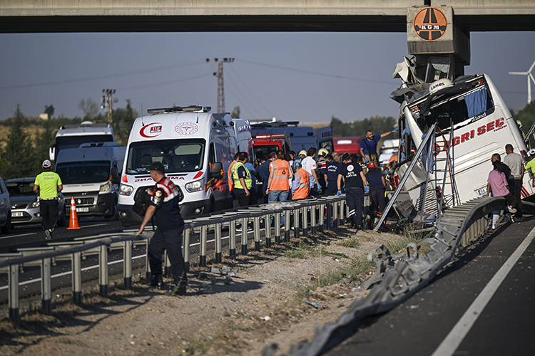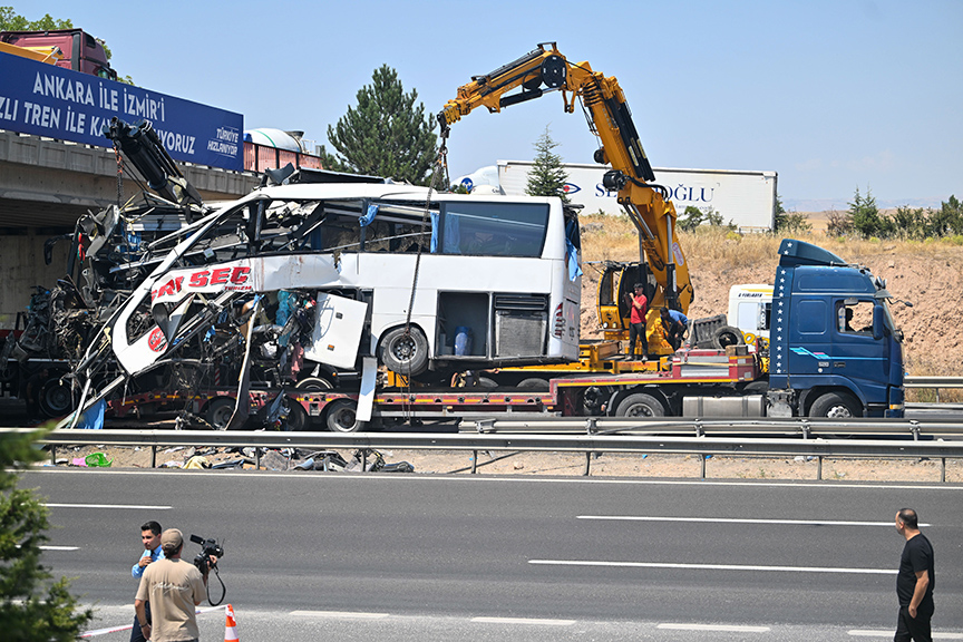 Ağrı’dan İzmir’e hareket eden Ç.K. yönetimindeki 04 AAV 951 plakalı yolcu otobüsü, dün saat 05.00 sıralarında Ankara-Eskişehir otoyolunun Eskişehir istikameti 53. kilometresi Sincan ilçesi Olukpınar mevkiinde yoldan çıkarak bir köprünün beton kolonuna çarptı. Kazada, otobüs şoförü Ç.K’nin da aralarında olduğu 9 kişi öldü, 27 kişi yaralandı. İhbar üzerine olay yerine gelen itfaiye ekipleri otobüste sıkışanları bulunduğu yerden çıkardı. Yaralılar, ambulanslarla çevredeki hastanelere sevk edildi. Kazanın meydana geldiği güzergah bir süre trafiğe kapatıldı. Ardından ekiplerin çalışmasıyla otobüs saplandığı köprünün ayağından çıkarıldı, trafik akışı da kontrollü olarak sağlanmaya başlandı.
