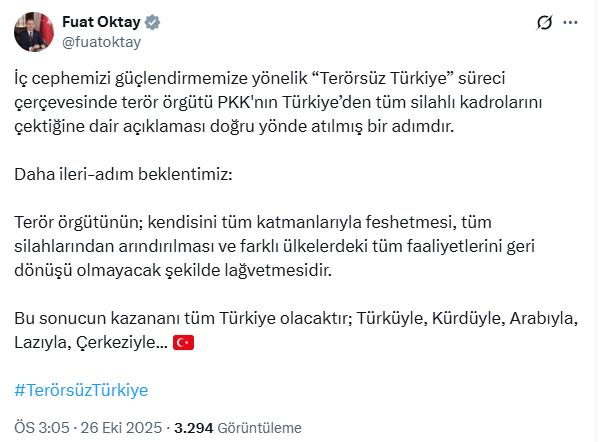 Sosyal medya platformu X hesabından açıklama yapan Fuat Oktay, “İç cephemizi güçlendirmemize yönelik ‘Terörsüz Türkiye’ süreci çerçevesinde terör örgütü PKK’nın Türkiye’den tüm silahlı kadrolarını çektiğine dair açıklaması doğru yönde atılmış bir adımdır” ifadelerini kullandı.