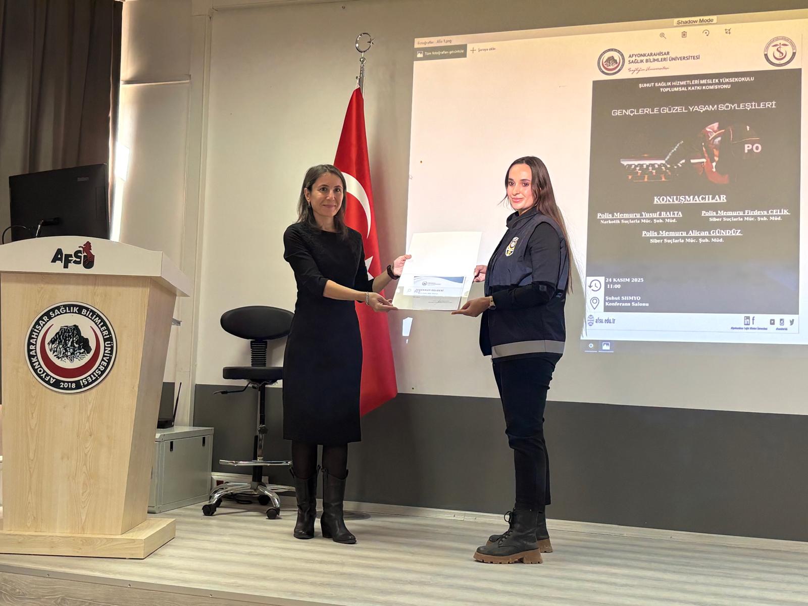 Öğrencilerin yoğun ilgi gösterdiği programda özellikle sosyal medya tuzakları, dijital ortamlarda bilinçli paylaşım yapmanın önemi ve kişisel verilerin korunması konuları üzerinde duruldu. Polis memurları, gençlerin günlük hayatta uygulayabilecekleri pratik güvenlik önerilerini de aktardı. Etkinliğin sonunda katkılarından dolayı konuşmacılara ve sürece öncülük eden Dr. Öğr. Üyesi Elçin Latife Kurtoğlu’na Teşekkür Belgesi takdim edildi.