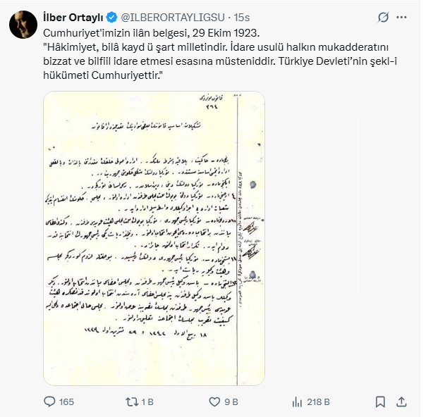 Ortaylı paylaşımında, Osmanlıca yazılı olan Cumhuriyet’in ilân belgesinin çevirisini de paylaştı. Belgede, “Hâkimiyet, bilâ kayd ü şart milletindir. İdare usulü halkın mukadderatını bizzat ve bilfiil idare etmesi esasına müsteniddir. Türkiye Devleti’nin şekl-i hükümeti Cumhuriyettir.” ifadeleri yer aldı.
