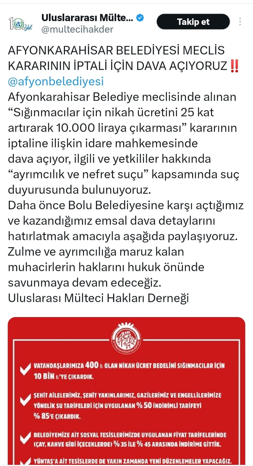Afyonkarahisar Belediye Meclisi geçtiğimiz günlerde aldığı kararla yabancı uyruklular için nikah işlem ücretini 400 liradan 10 bin liraya çıkaran bir karar almıştı. Uluslararası Mülteci Hakları Derneği adlı oluşum, sosyal medya hesabından yaptığı paylaşımla, yargının yürütmenin durdurulması kararını verdiğini iddia etti.>>>Kadir Kaplan