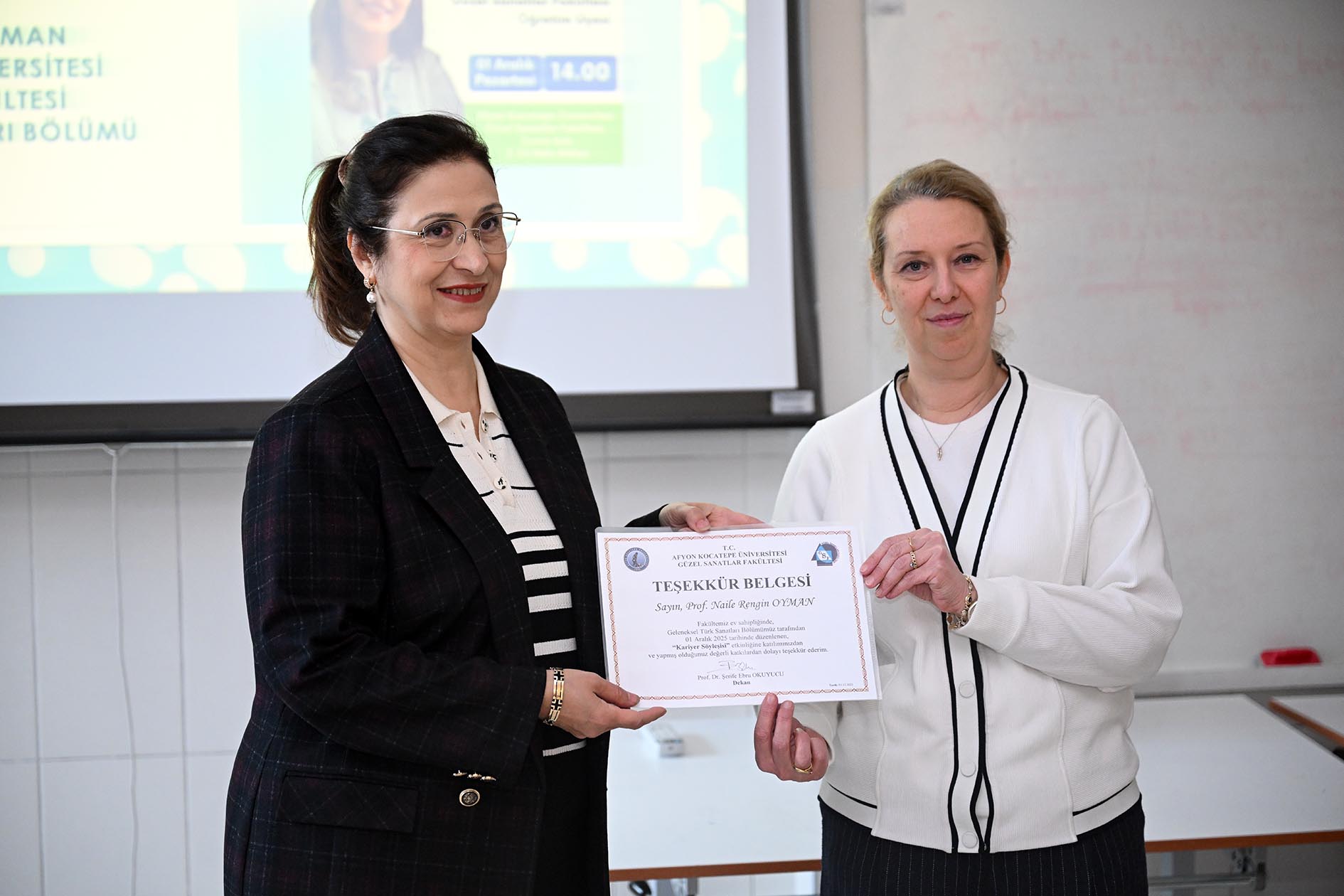 Prof. Naile Rengin Oyman, Geleneksel Türk Sanatlarının Türk kültürünün Orta Asya’dan Selçuklu’ya, Osmanlı’dan bugüne uzanan estetik, teknik ve sembolik birikimini temsil eden uygulamalı ve görsel sanat disiplinlerinin bütünü olduğunu kaydetti. Alanın tezhip, minyatür, kalemişi, çini, ebru, halı ve kilim dokuma, geleneksel kumaş tasarımı ve hat sanatı gibi birbirini tamamlayan birçok sanat dalını kapsadığını belirten Oyman, Geleneksel Türk Sanatlarının ortak özelliklerine ilişkin bilgiler paylaştı. Oyman, “Kökleri çok derin, çok kadim sanatların toplandığı bir bütündür. Sembolik anlamlar taşıyor, tam bir semboller dünyası. Teknik ustalık gerektiriyor ve estetik kültürün devamlılığını sağlıyor. Çağdaş sanat ve tasarımlarla da uyumlu olarak yeniden üretilebilir projeler yapabiliyorsunuz” dedi. Geleneksel Türk Sanatları Bölümünün açılma gerekçeleri hakkında bilgi veren Prof. Oyman, bu bölümün açılmasında sanatsal, kültürel ve toplumsal temellere dayanıldığını söyledi. Oyman, “Bu gerekçelerin başında, çok kadim bir uygarlığın mirası olan kültürel değerlerimizin korunması geliyor” dedi. Söyleşi, soru cevap bölümünün ardından teşekkür belgesinin takdim edilmesiyle sona erdi.