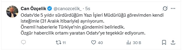 Can Özçelik, açıklamasında özgür habercilik ortamı sunduğunu belirttiği Odatv’ye teşekkür ederek, görev süresi boyunca destek verenlere de mesaj gönderdi.