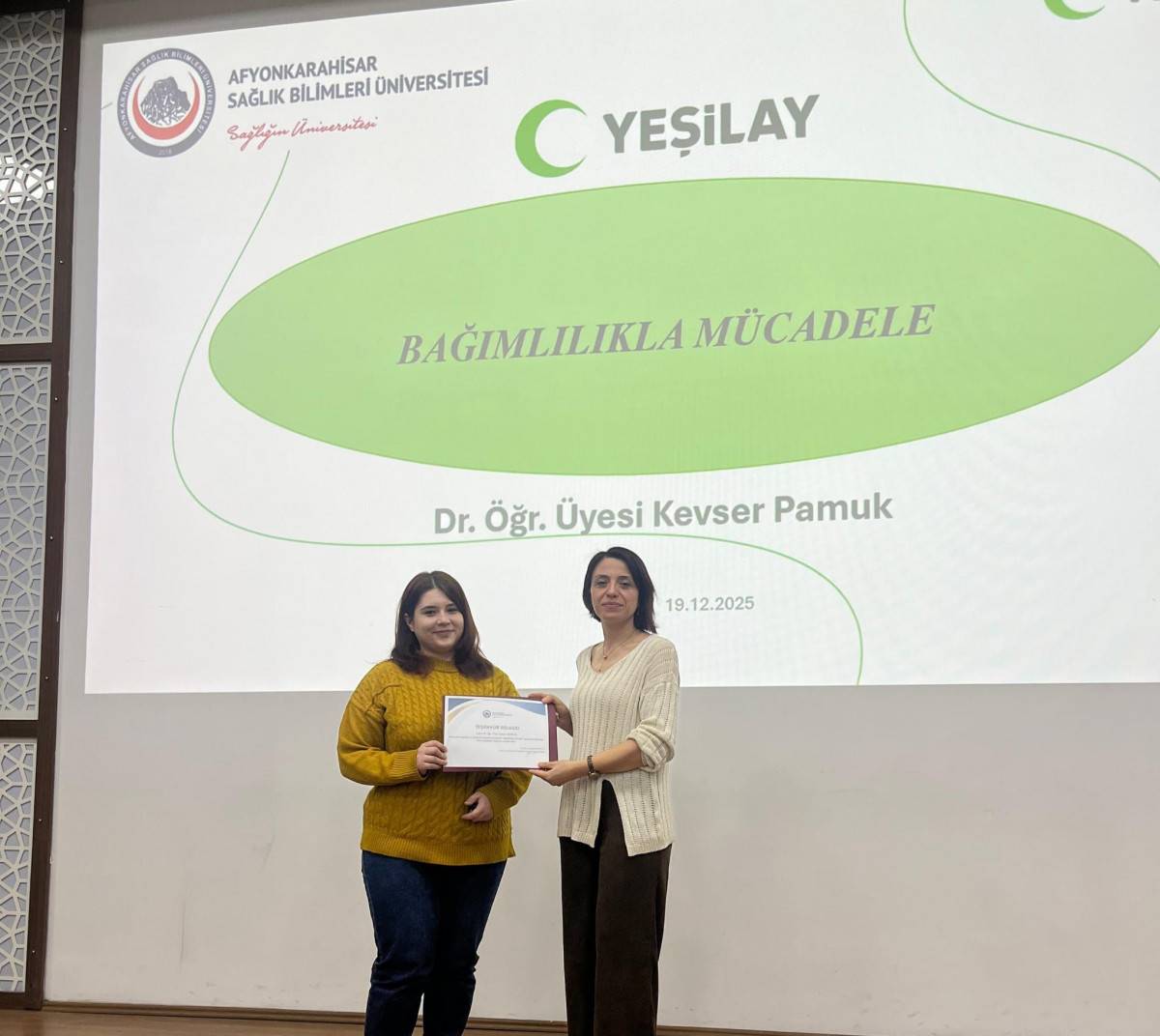 AFSÜ KAGİM Müdür Yardımcısı Dr. Öğr. Üyesi Kevser Pamuk tarafından verilen eğitimde bağımlılık türleri, risk etmenleri, bağımlılıktan korunma yolları ve etkili baş etme stratejileri, bilimsel bir bakış açısıyla ele alındı. Öğrencileri bağımlılıklar konusunda bilinçlendirmek ve sağlık yaşam alışkanlıklarına teşvik etmek amacıyla yapılan eğitim, Dr. Öğr. Üyesi Pamuk’a, Teşekkür Belgesi takdimi ile sona erdi.