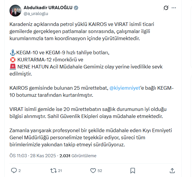“Karadeniz açıklarında petrol yüklü KAIROS ve VIRAT isimli ticari gemilerde gerçekleşen patlamalar sonrasında, çalışmalar ilgili kurumlarımızla tam koordinasyon içinde yürütülmektedir.