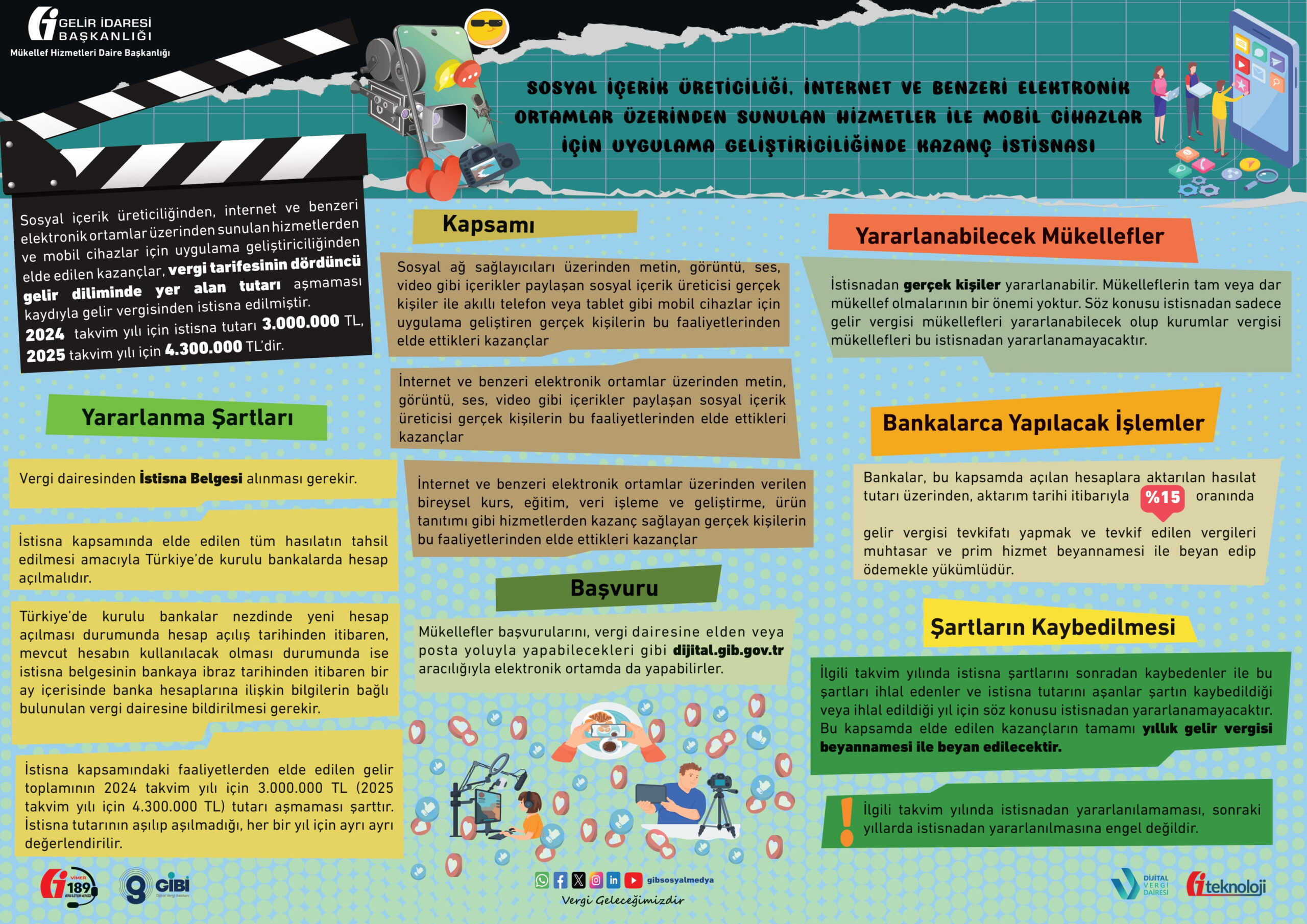 Bu kapsamda, internet ve benzeri elektronik ortamlar üzerinden metin, görüntü, ses, video gibi içerikler paylaşan sosyal içerik üreticilerinin bu faaliyetlerinden elde ettikleri kazançlar ve bu ortamlar üzerinden verilen bireysel kurs, eğitim, veri işleme ve geliştirme, ürün tanıtımı gibi hizmetlerden sağlanan kazançlar ile akıllı telefon veya tablet gibi mobil cihazlar için uygulama geliştirenlerin elektronik uygulama paylaşım ve satış platformları üzerinden elde ettikleri kazançlar vergi tarifesinin dördüncü gelir diliminde yer alan tutarı (2024 takvim yılı için 3.000.000 TL, 2025 takvim yılı için 4.300.000 TL) aşmaması kaydıyla gelir vergisinden istisnadır.
