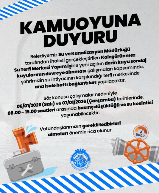 Yapılan açıklamada, “Belediyemiz Su ve Kanalizasyon Müdürlüğü tarafından ihalesi gerçekleştirilen Kalegörünmez Su Terfi Merkezi Yapım İşi ile yeni açılan derin kuyu sondaj kuyularının devreye alınması çalışmaları kapsamında, şehrimizin su ihtiyacının karşılandığı terfi merkezinde ana isale hattı bağlantıları yapılacaktır. Söz konusu çalışmalar nedeniyle 06/01/2026 ve 07/01/2026 tarihlerinde, 08.00-19.00 saatleri arasında basınç düşüklüğü ve su kesintisi yaşanabilecektir. Vatandaşlarımızın gerekli tedbirleri almaları önemle rica olunur” denildi.