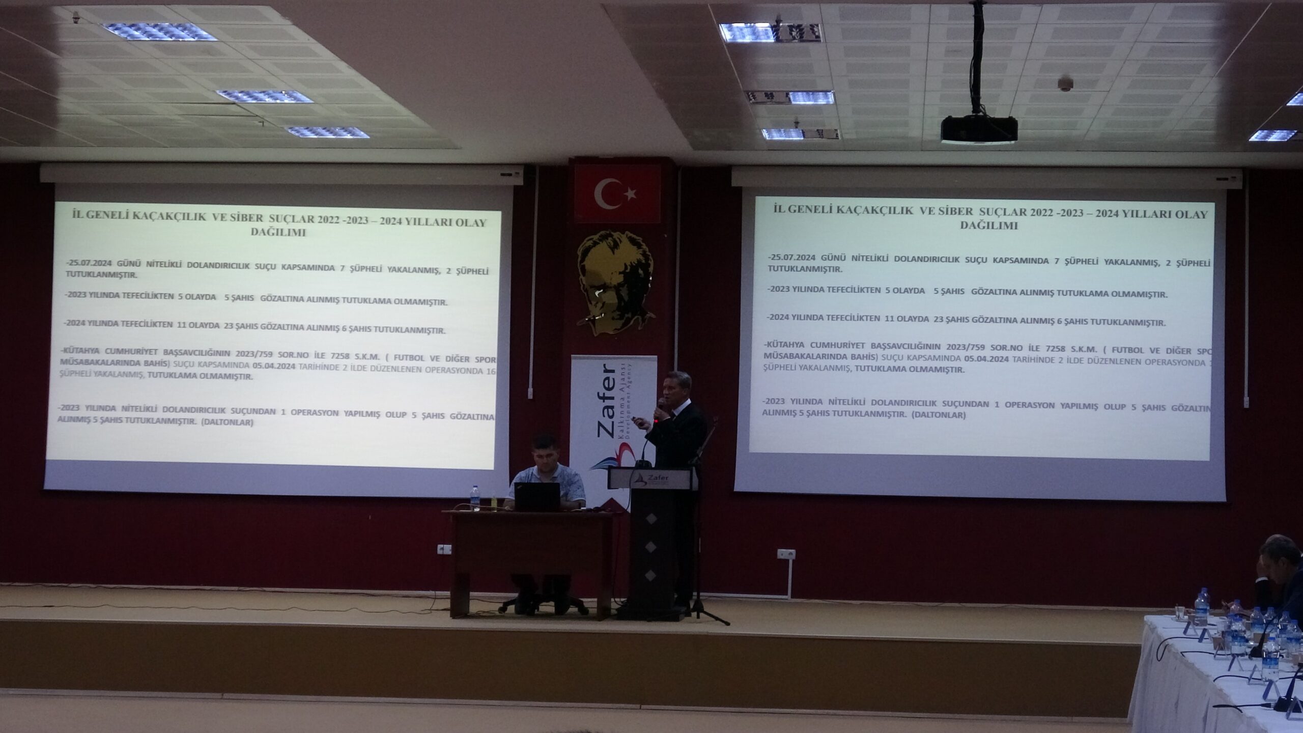 Toplantıda konuşan Kütahya Emniyet Müdürü Hakan Sıralı tarafından sunulan verilere göre, Kütahya’da mal varlığına karşı işlenen 9 suç türünde düşüşler yaşandı. Açıktan hırsızlık olayları 2022’de 145, 2023’te 165 ve 2024’te 65 olarak kaydedildi. Dolandırıcılık vakalarında da 2022’de 581 olan olay sayısı, 2024’te 44’e düştü. Kütahya genelinde kişilere karşı işlenen suçlarda da önemli oranlarda azalmalar gözlemlendi. Kasten yaralama olayları 2022’de 2.199 iken, 2024’te 1.238’e düştü. Tehdit suçları 2022’de 1.021, 2024’te ise 602 olarak kaydedildi. Kişiyi hürriyetinden yoksun kılma olayları ise 2022’de 22 iken, 2024’te 14’e düştü. 2024’ün ilk 7 ayında, Kütahya’da aranan şahısların yakalanma oranı yüzde 98,2 olarak Türkiye ortalaması olan yüzde 96,6’nın üzerine çıktı. İfadeye yönelik aranan şahısların yakalanma oranı yüzde 26,9, hapis cezasına yönelik aranan şahısların yakalanma oranı ise yüzde 35,8 olarak belirlendi. Toplamda, polis sorumluluk bölgesinde 912 aranan şahıs bulunmakta olduğu ve şahısların yakalanmasına yönelik çalışmaların devam ettiği kaydedildi. Kadına karşı şiddet olaylarında 2023 yılında 943, 2024 yılında 781 olay meydana geldi ve yüzde 17’lik bir düşüş gözlemlendi. 2024 yılında tutuklanan şahıs sayısı 6 olurken tutuklanma oranında yüzde 50 artış sağlandı.